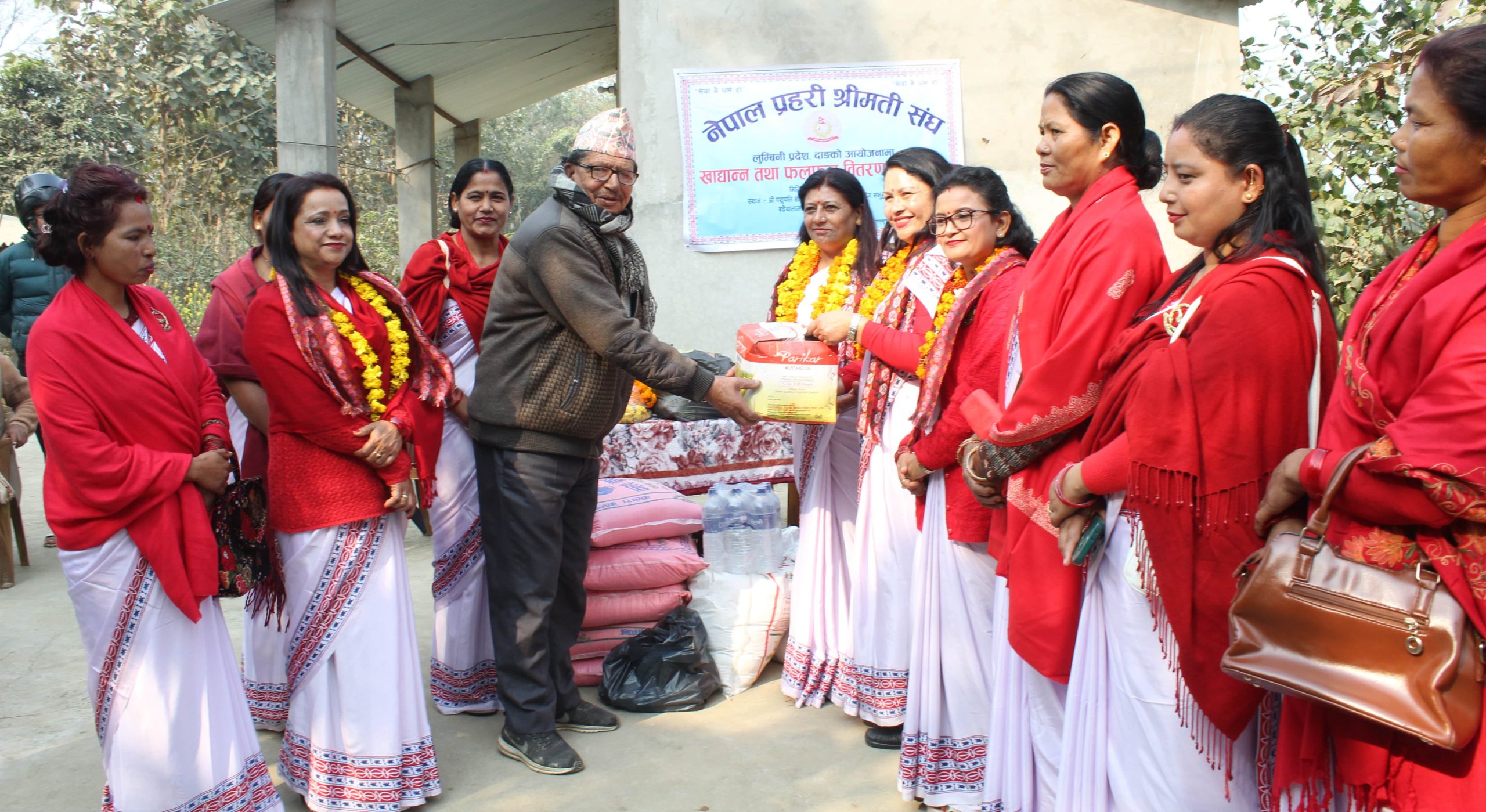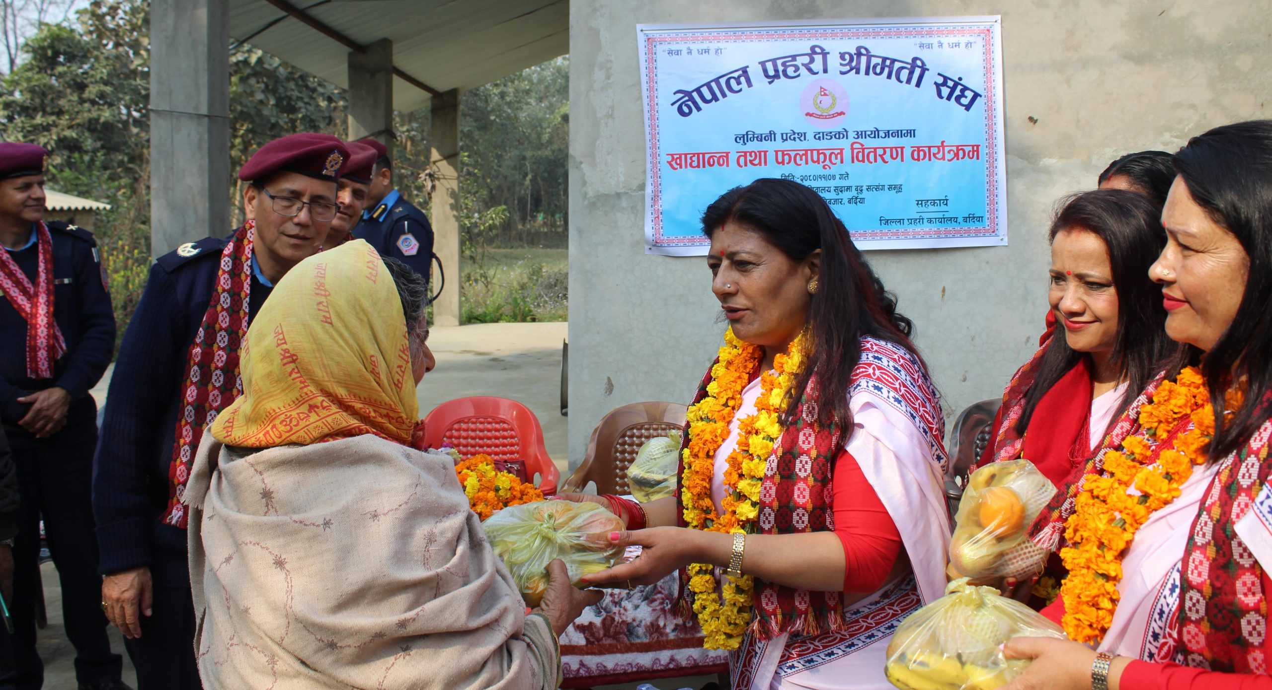 सोही अवसरमा नेपाल प्रहरी श्रीमती संघ लुम्बिनी प्रदेशको आयोजनामा र जिल्ला प्रहरी कार्यालय बर्दियाको सहकार्यमा बर्दियाको बढैयाताल गाउँपालिका वडा नम्बर ८ पशुपति बजारस्थित पशुपति शान्ति शिवालय सुदामा बृद्ध सत्संग समुह बृद्ध आश्रममा रहेका बृद्ध बृद्धाहरुलाई नेपाल प्रहरी श्रीमती संघकी अध्यक्ष श्रीमती लक्ष्मी कुँवरले दैनिक उपभोग्य खाद्यान्न सामाग्री तथा फलफुल समेत वितरण गर्नुभएको थियो ।