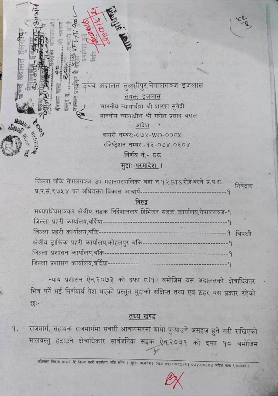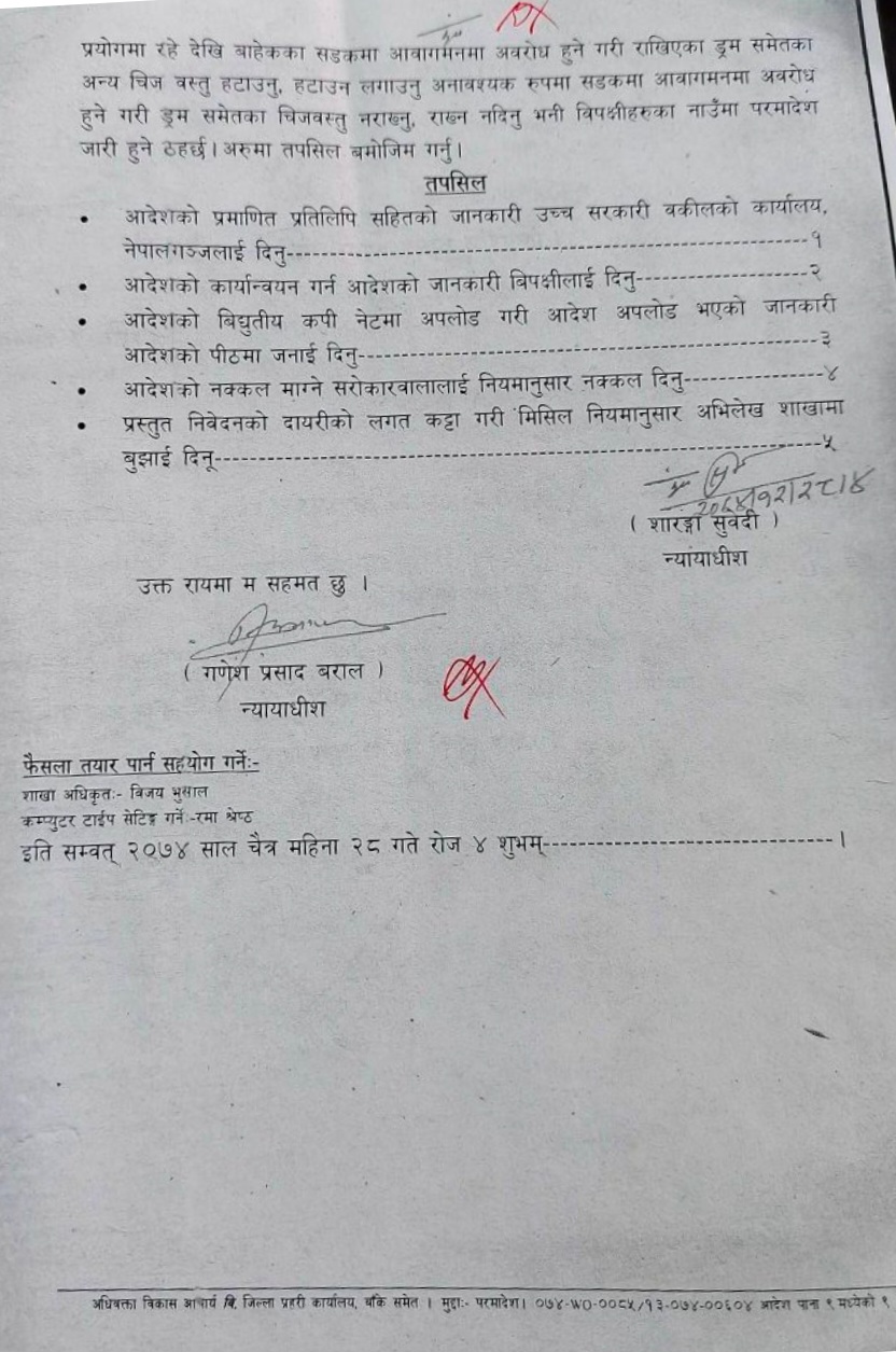 उच्च अदालत तुल्सीपुर, नेपालगन्ज ईजलासका न्यायाधीश शारंगा सुवेदी र गणेशप्रसाद बरालले २०७४ चैत २८ गते फैसला हुँदा आवागमनमा अवरोध हुने गरी ड्रम समेतका चीज वस्तु नराख्न भनी विपक्षीहरूको नाउमा परमादेशको आदेश जारी भएको थियो ।