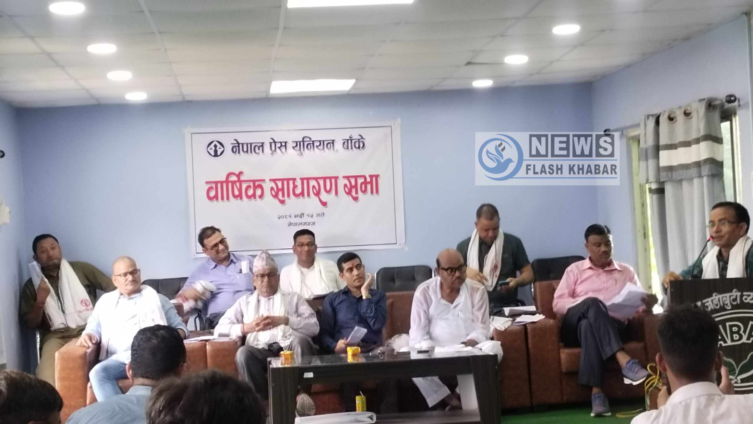 नेपालगञ्ज । नेपाल प्रेस युनियन बाँकेको वार्षिक साधारण सभा शनिबार सम्पन्न भएको छ । युनियन बाँकेले पहिलो पटक वार्षिक साधारण सभा गरेको हो । युनियनको इतिहासमा यसभन्दा अघि वार्षिक रुपमा साधारण सभा भएको छैन् ।