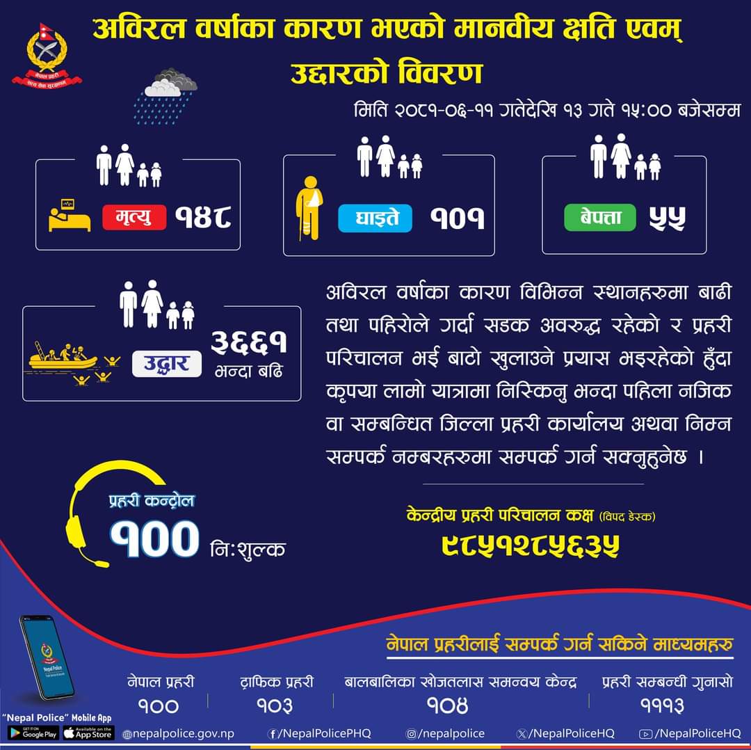 नेपाल प्रहरीले आज जारी गरेको तथ्यांक अनुसार अविरल बर्षापछि आएको बाढी, पहिरोमा परी आइतबार दिउँसो तीन बजेसम्म देशभर एक सय ४८ जनाको मृत्यु भएको छ । भने एक सय १ जना घाइते रहेको र ५५ जना बेपत्ता भएका छन । भने ३ हजार ६ सय ६१ जनाको उद्धार गरिएको नेपाल प्रहरीले जारी गरेको सूचनामा उल्लेख छ ।