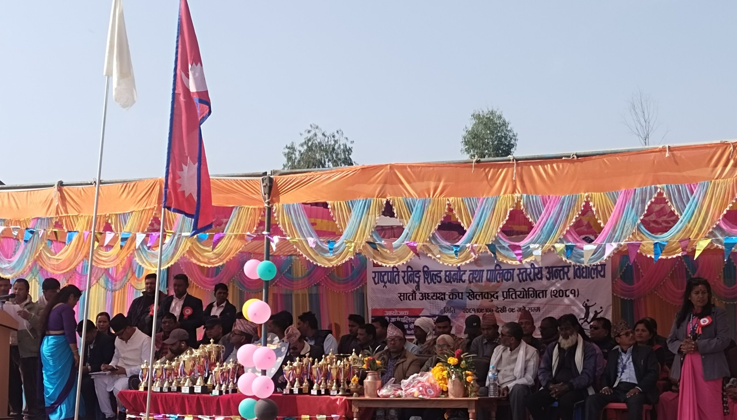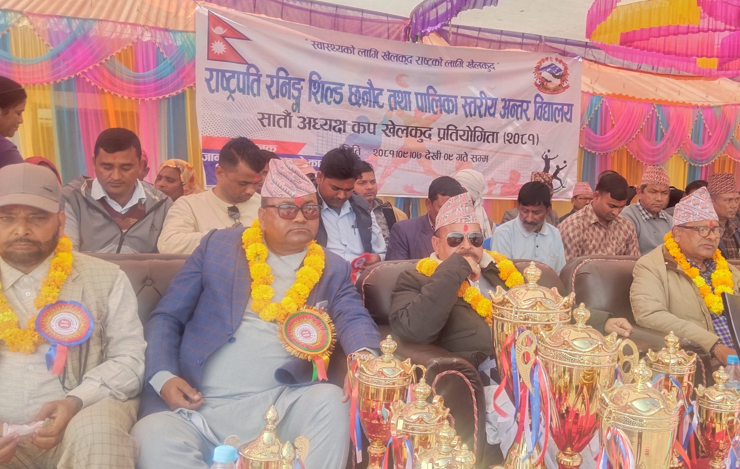 मानपुर । “स्वास्थ्यको लागि खेलकुद, राष्ट्रको लागि खेलकुद” भन्ने मूल नारासहित राष्ट्रपति रनिङ शिल्ड तथा ७औं विद्यालय स्तरीय अध्यक्ष कप प्रतियोगिता आजबाट शुरु भएको छ । बाँकेको जानकी गाउँपालिकास्थित श्री नेपाल राष्ट्रिय कन्या आधारभूत विद्यालय मानपुरको खेलमैदानमा आइतबारदेखि शुरु भएको हो ।जानकी गाउँपालिका शिक्षा युवा तथा खेलकुद शाखा मानपुरको आयोजनामा पुष ७ गतेदेखि तीन दिनसम्म चल्ने प्रतियोगिताको उद्घाटन जिल्ला समुन्वय समितीका सभापति ज्ञानेन्द्र चौधरी र पालिका अध्यक्ष छब्बन खाँले संयुक्त रूपमा पानसमा बत्ती बालेर उद्घाटन गर्नुभएको थियोे ।उद्घाटन समारोहमा बोल्दै जिल्ला विकास समिती बाँकेका सभापति चौधरीले पढ्ने र खेल्ने उमेरमा अहिले धेरै विद्यार्थीले नशा सेवन गरिरहेको अबस्था रहेको बताउँदै कुलत छाडेर पढाई र खेलकुदमा ध्यान केन्द्रित गर्नुपर्नेमा जोड दिए । उनले जानकी गाउँपालिकामा विद्यालयहरुको नतिजा राम्रो नआएकाले अभिभावकहरु पनि सचेत हुनुपर्ने बताए ।गाउँपालिका अध्यक्ष खाँले शिक्षा र खेलकुद विकासको लागि गाउँपालिकाबाट हुने सहयोगमा कुनै पनि कसर नराख्ने बताउनुभयो । उद्घाटनमा शिक्षा युवा तथा खेलकुद शाखा मानपुरकि प्रमुख कृष्णा कुमारी भण्डारीले स्वागत मन्तब्य ब्यक्त गरेको कार्यक्रममा सभाध्यक्ष खाँलाई विभिन्न विद्यालयका विद्यार्थीहरुले मार्चपास गर्दै सलामी अर्पण गरेका थिए ।जानकी गाउँपालिकाको आर्थिक सहयोगमा सञ्चालन गरिएको प्रतियोगितामा पालिका अन्तर्गतका रहेका ३९ वटा विद्यालय मध्ये ११ वटा विद्यालय सहभागी प्रतियोगिताको पहिलो दिन दुई समूहमा छात्रहरुको भलिबल खेलमा मावि बन्जारेगाउँ र ब्राइटस्टार इंग्लिस स्कुल विजेता भएका छन् । यस्तै छात्राहरुको कवड्डीतर्फ समूहमा मावि भटनपुरवा, ब्राइटस्टार, शिवपुरी मावि र जानकी मावि विजेता भएका छन् । प्रतियोगिता पुस ९ गतेसम्म सञ्चालन हुनेछ ।कार्यक्रममा नेपाली काँग्रेसका सभापति नारायण गौडेल, नेपाली काँग्रेसका पुर्वसभापति किरण कोइराला, नेपाली काँग्रेस महासमिति सदस्य बाँकेका सदस्य लक्ष्मी नारायण शाह, मदरसा व्यवस्थापन समिती लुम्बिनी प्रदेशका सभापति नक्की खाँ, गाउँपालिकाकी उपाध्यक्ष रामप्यारी यादव, प्रमुख प्रशासकीय अधिकृत सुनिल नेपाली, वडा नम्बर १ का अध्यक्ष युनुस राई (रजा), वडा नम्बर ३ का अध्यक्ष राजकुमार वर्मा, वडा नम्बर ५ का वडा अध्यक्ष एवं प्रवक्ता टिकानाथ यादव, सामाजिक विकास समितिका संयोजक रामअचल धोवी, विपद तथा वातावरण व्यवस्थापन समितीका संयोजक राजेन्द्र सिंह, समाजसेवी पदम धिताल, जानकी गाउँपालिकाका पुर्वअध्यक्ष भुमिसरा धिताल, विभिन्न शाखा प्रमुखहरु, विभिन्न विद्यालयका प्रधानाध