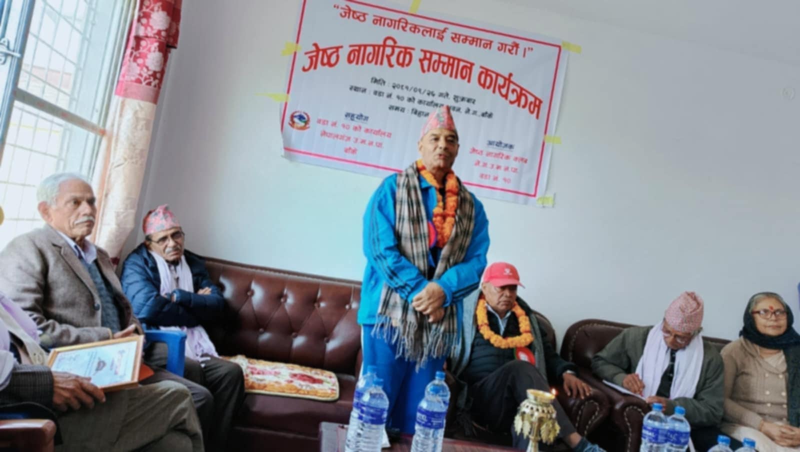जेष्ठ नागरिकको समाजप्रतिको विगतको योगदानलाई स्मरण गर्दै सम्मान स्वरुप उपहारसहित सम्मान गरिएको हो । जेष्ठ नागरिकलाई सम्मान गर्दै प्रतिनीधी सभा सदस्य तथा नेपालगन्ज उपमहानगरपालिकाकाका पुर्व नगर प्रमुख डा. धवल शमशेर राणाले जेष्ठ नागरिकको सम्मान गर्ने परम्परा आफनै कार्याकालमा शुरु गरिएको जनाउँदै यसलाई अझै व्यवस्थित र प्रभावकारी बनाउनु पर्ने आवश्यक्ता औल्याउनु भयो ।