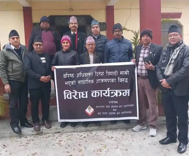 नेपालगन्ज । वरिष्ठ अधिवक्ता दिनेश त्रिपाठी माथी भएको सांघातिक आक्रमणका विरुद्धमा आज नेपालगन्जमा कानुनी व्यवसायीहरुले विरोध गरेका छन । काठमाडौं जिल्ला अदालतमा विचाराधीन रहेको पुर्व गृहमन्त्री रवि लामिछाने विरुद्धको मुद्दामा बहस पैरवी गरेकाे विषयमा त्रिपाठी माथी भएको सांघातिक आक्रमणको विरोधमा आइतबार कानुनी व्यवसायीहरुले विरोध गरेका हुन ।