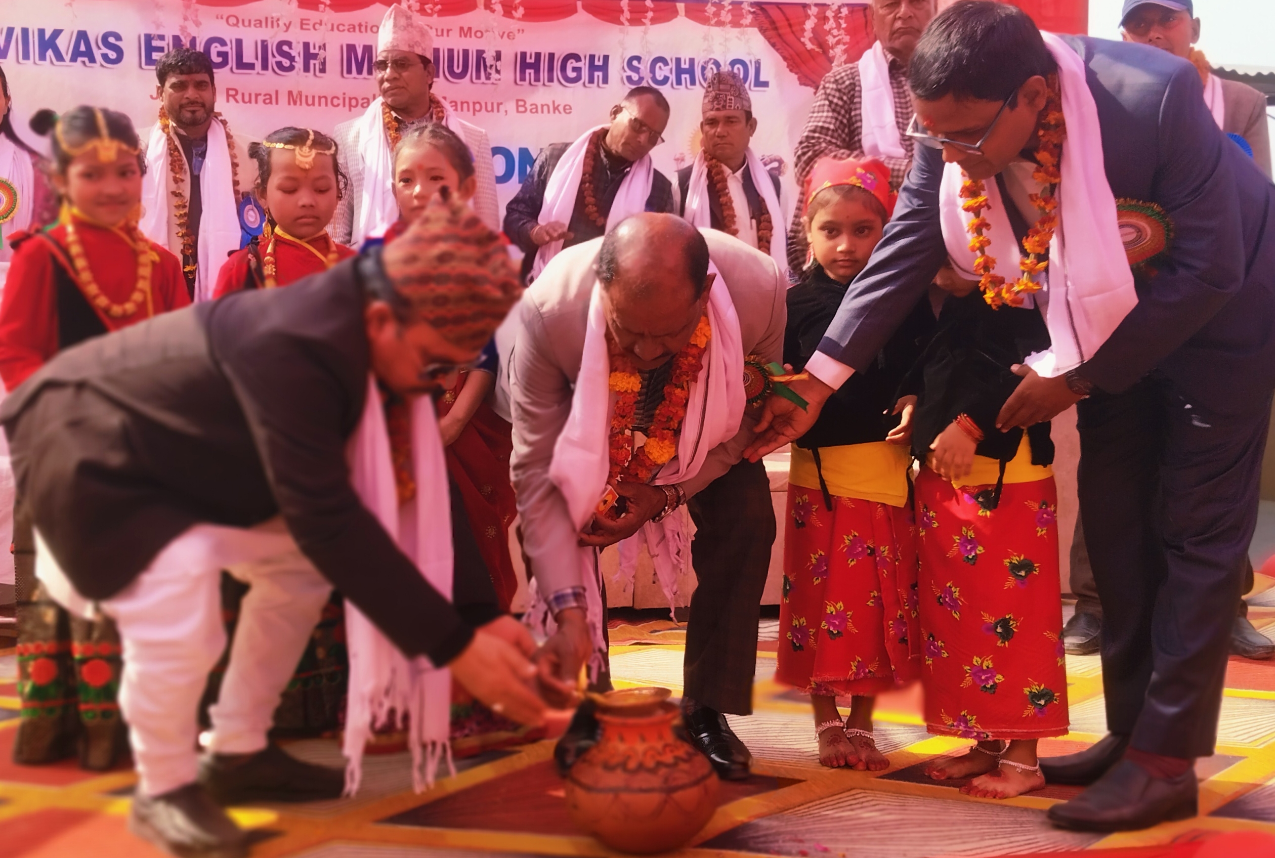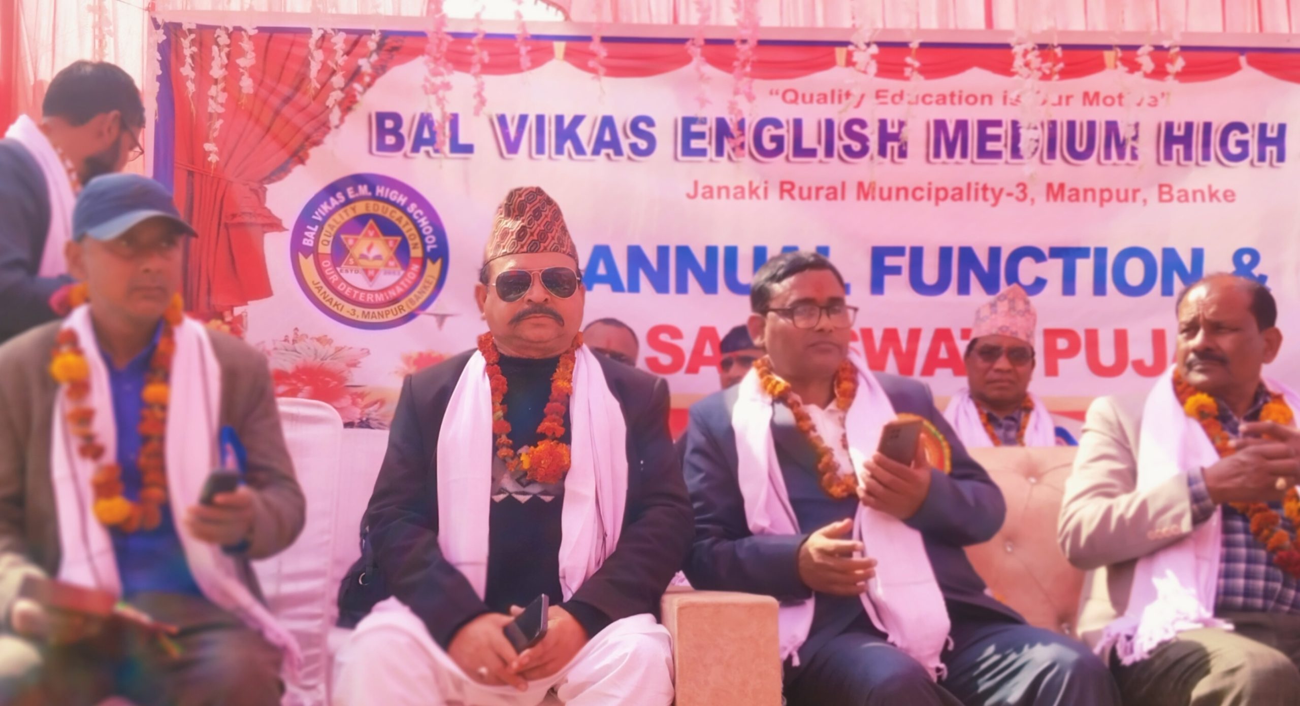 मानपुर । बाँकेको जानकी गाउँपालिका मानपुरस्थित बाल विकास इङलिस मिडियम हाई स्कुलले आफ्नो वार्षिकोत्सव तथा सरस्वती पूजा भब्य सम्पन्न गरेको छ । बसन्त पञ्चमीको अवसर पारेर स्कुलको आयोजनामा वार्षिकोत्सव तथा सरस्वती पूजा विविध कार्यक्रम गरी सोमबार सम्पन्न गरेको हो ।लुम्बिनी प्रदेश सदस्य बादशाह कुर्मीको प्रमुख अतिथी र जानकी गाउँंपालिका अध्यक्ष छब्बन खाँको विशिष्ट अतिथीमा वार्षिकोत्सव तथा सरस्वती पूजाको उद्घाटन घैटोमा बत्ती बालेर गरेका थिए । कार्यक्रममा बोल्दै कुर्मीले विद्यालयले आफ्नो वार्षिक उत्सव तथा सरस्वती पुजाको अवसर पारेर विज्ञान प्रदर्शनी अवलोकन गर्दा खुशी महसुस भएको बताउनुभयो । उनले वर्षभरि शैक्षिक तथा अतिरिक्त क्रियाकलापमा उत्कृष्ट कार्यप्रति विद्यार्थीलाई धन्यवादसमेत दिएका थिए ।यस्तै जानकी गाउँंपालिका अध्यक्ष खाँले यो विद्यालय शैक्षिक तथा अतिरिक्त क्रियाकलापमा जिल्लामा दोस्रो उत्कृष्ट स्थान हासिल गरेको र विद्यालयको स्तर अझै माथी उठाउन पालिकाले आवश्यक सहयोग गर्न प्रतिबद्ध रहेको बताउनुभयो । विद्यालय आवतजावतमा विद्यार्थीलाई कठिनाइ भएको चिन्ता व्यक्त गर्दै दुई महिनामा बाटो निर्माण कार्य अगाडि बढाउन समेत उहाँले बताए ।वार्षिकोत्सवको अवसरमा आधा दर्जनबढी व्यक्तिलाई सम्मान गर्दै विद्यार्थीले सांस्कृतिक, नृत्य र कराँतेका विभिन्न चरणहरुको प्रदर्शन समेत गरेका थिए । विद्यालय प्रांगणमा विज्ञान प्रदर्शनी स्टलसमेत बनाइएको थियो । विद्यालयका निर्देशक बिनोद कुमार वर्माको अध्यक्षतामा भएको कार्यक्रममा स्वागत मन्तब्य प्रधानाध्यापक ओम प्रकाश वर्माले गरेका थिए भने कार्यक्रम सञ्चालन आंसिक शिक्षक आरिफ खानले गरेका थिए ।कार्यक्रममा जानकी गाउँपालिका बाँकेका प्रमुख प्रशासकीय अधिकृत नर बहादुर विक, विद्यालयका संस्थापक अब्दुल गफ्फार खान, शिक्षा शाखा प्रमुख कृष्णा कुमारी भण्डारी, रामअचल धोबी, पालिका प्रवक्ता एवं वडा नम्बर ५ का अध्यक्ष टिकानाथ यादव, वडा नम्बर ४ का अध्यक्ष, रमेश कुमार वर्मा, विपद तथा वातावरण व्यवस्थापन प्राविधिक सहायक झुमी कुमारी ओली, विपद तथा वातावरण व्यवस्थापन समितीका संयोजक राजेन्द्र सिंह, समाजसेवी, शिक्षक, अभिभावक, विद्यार्थी लगायतको बाक्लो उपस्थिति रहेको थियो ।