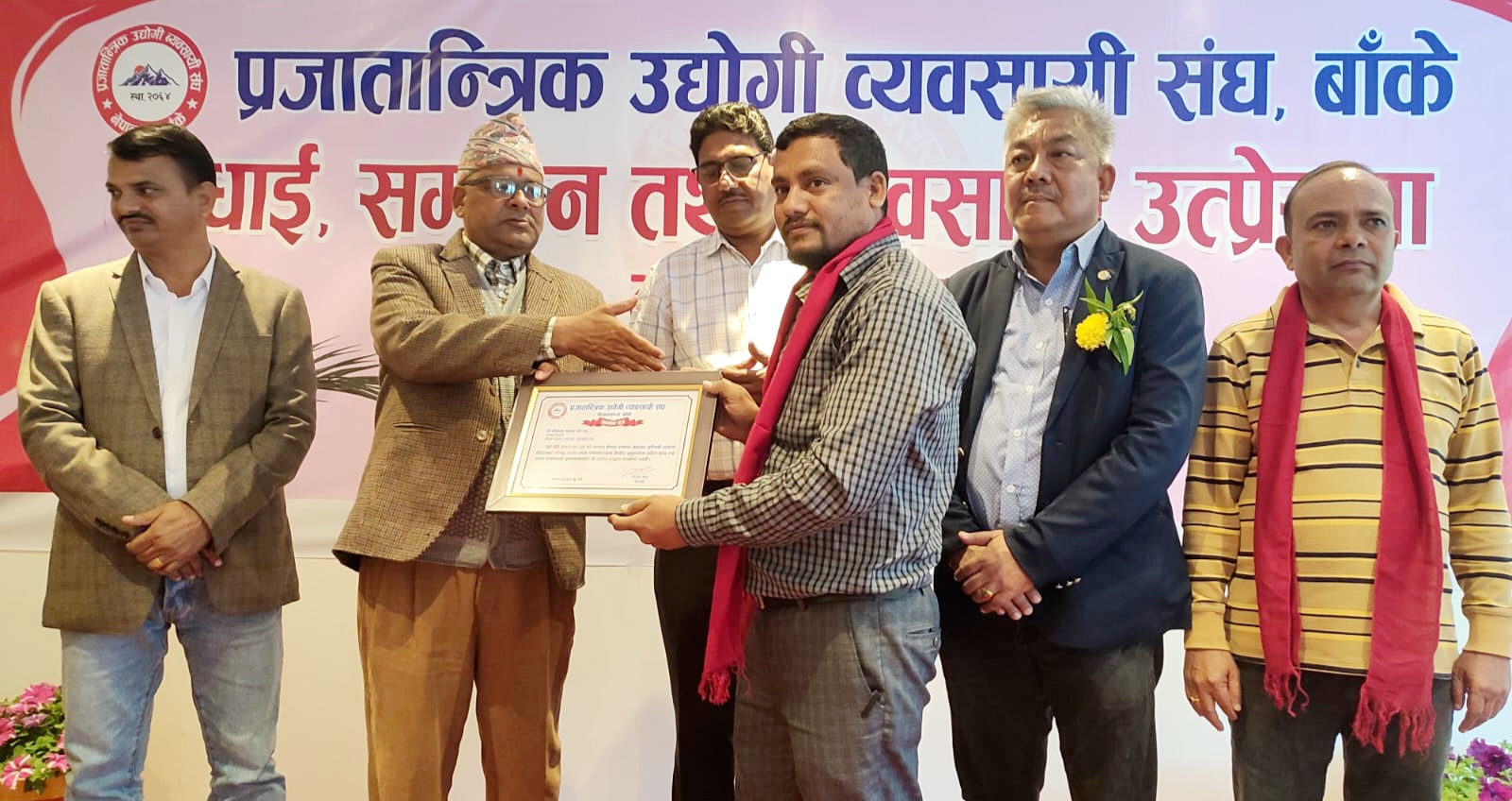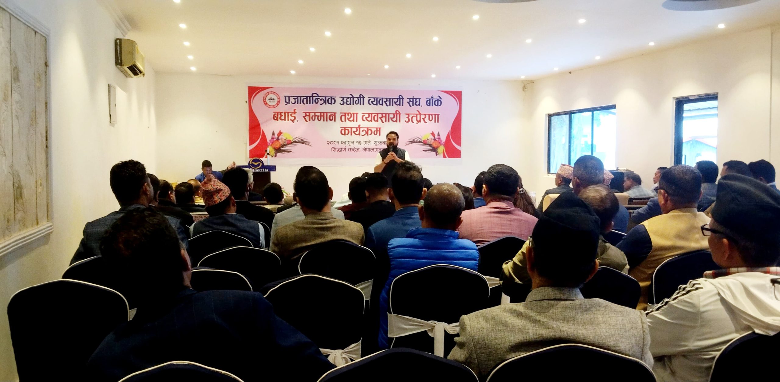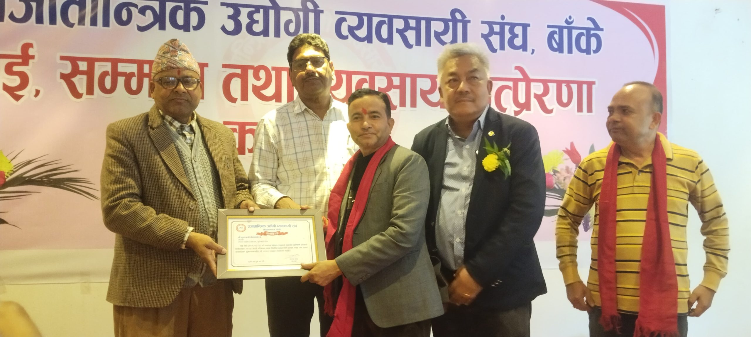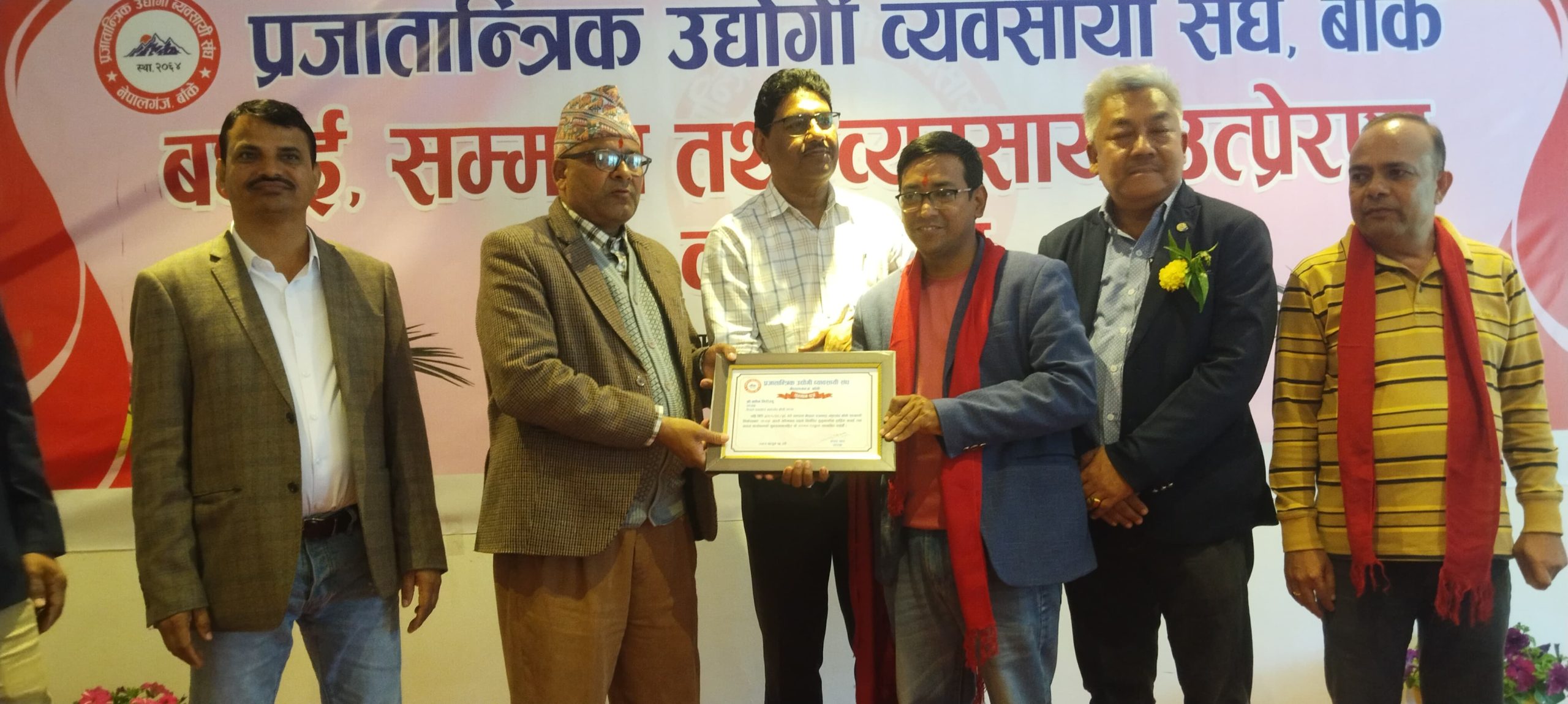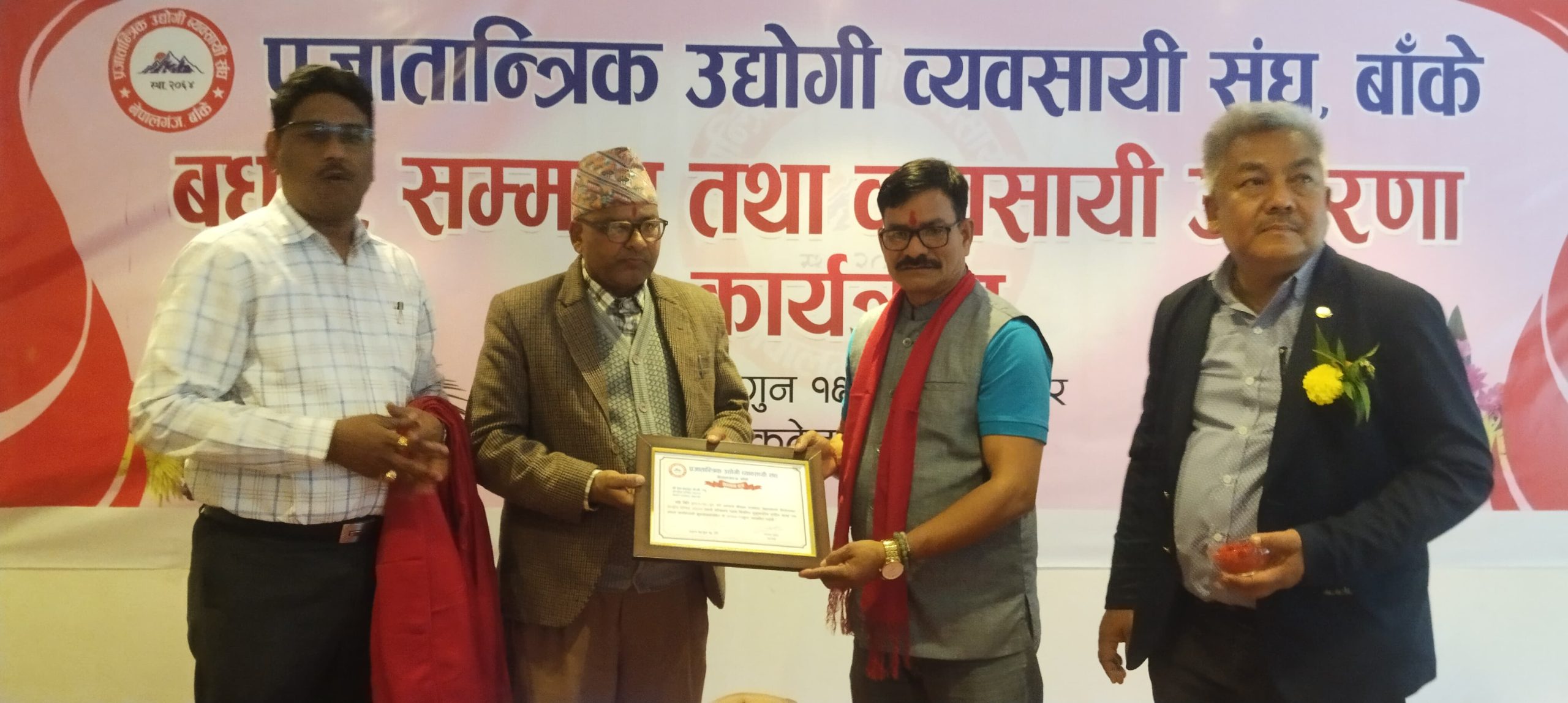 संघका अध्यक्ष संजय थापाको सभापतित्वमा र काँग्रेस बाँकेका सभापति गौडेलको प्रमुख अतिथि तथा काँग्रेस बाँकेका उपसभापति एवं प्रजातान्त्रिक उद्यागी व्यवसायी संघका सल्लाकार गोपाल प्रसाद अधिकारी, कोहलपुर उद्योग वाणिज्य संघका अध्यक्ष प्रदिप भट्टराई, वरिष्ठ उद्योगपती प्रदिप छाछेड लगायतको विशिष्ट अतिथिमा भएको बधाई, सम्मान तथा उत्प्रेरणामा कार्यक्रममा बोल्दै नेपाली काँग्रेस बाँकेका उपसभापति अधिकारीले सरकार व्यवसायमा समस्या ल्याउने कानुन संशोधन गरेर व्यवसाय सहज रुपमा गर्ने वातावरण बनाउनु पर्ने जिकिर गरे ।