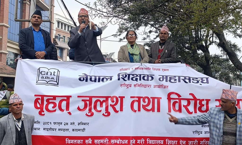 काठमाण्डौ । शिक्षकहरूले विद्यालय शिक्षा विधेयक छिटो अगाडि नबढेकामा नेपाल शिक्षक महासङ्घले आपत्ति जनाएको छ । शिक्षा ऐन जारी गर्न माग गर्दै महासङ्घले पहिलो चरणको आन्दोलन सकेर दोस्रो चरणको आन्दोलन घोषणा गरेको हो ।