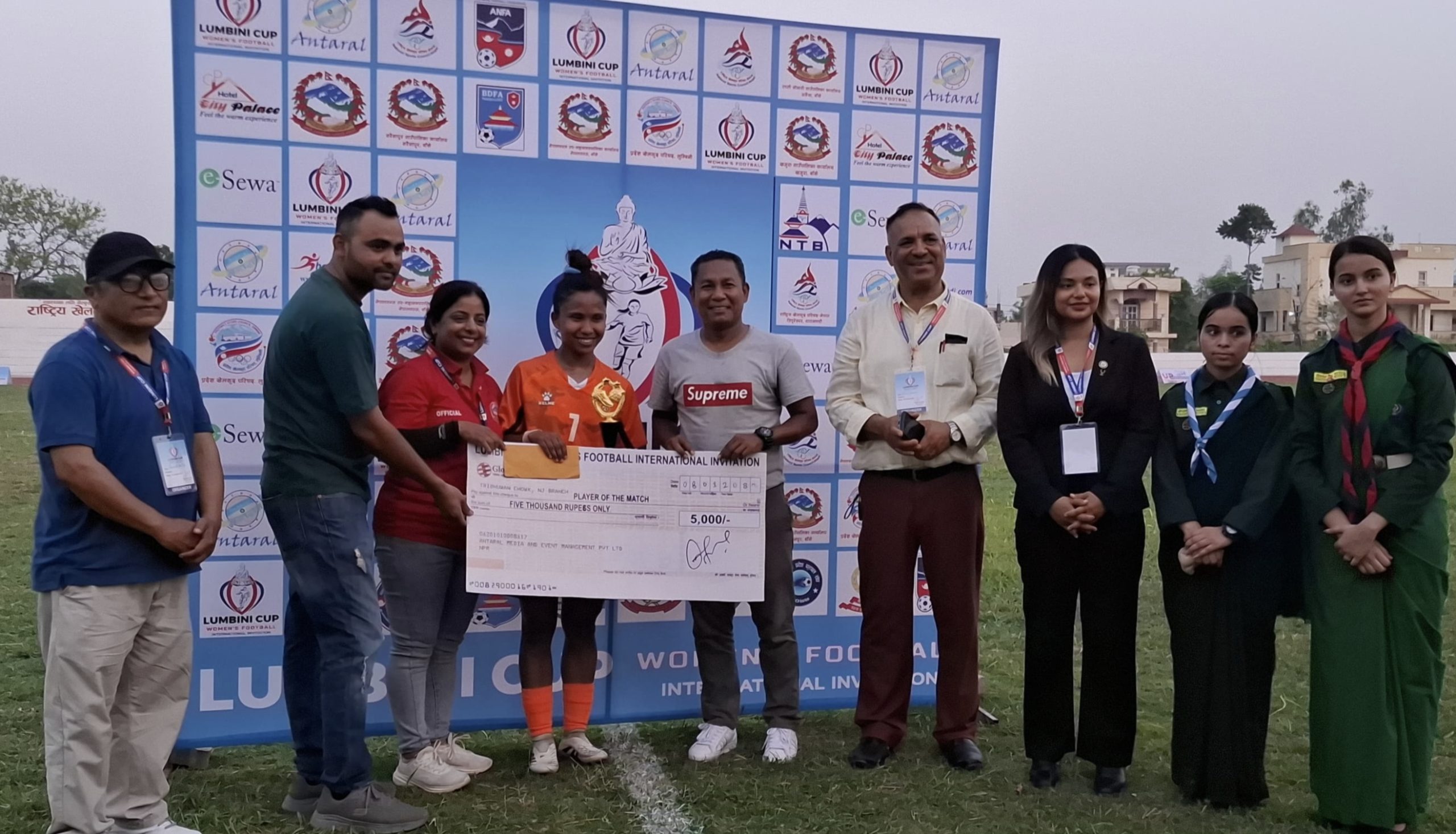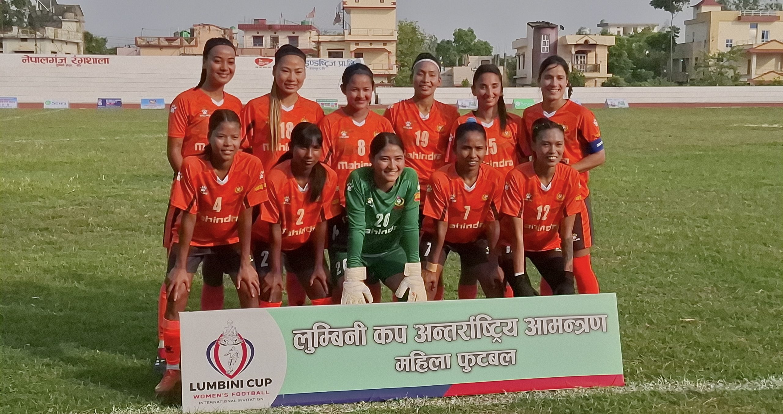 नेपालगन्ज । बाँकेको नेपालगन्ज रंगशालामा जारी अन्तर्राष्ट्रिय आमन्त्रण लुम्बिनी कप महिला फुटबल प्रतियोगिताको अन्तिम क्वाटर फाइनल खेलमा विभागीय टोली सशस्त्र प्रहरी बलको एपिएफ क्लबले जित हासिल गरेको छ । कर्णालीप्रदेश प्रदेशफुटबल संघ विरुद्ध ६–० गोल अन्तरले जित निकाल्दै विभागीय टोली सशस्त्र प्रहरी बलको एपिएफ क्लब सेमिफाइनलमा प्रवेश गरेको हो ।खेलको सुरुवाती अवस्थामा दुबै टोलीको खेल निकै प्रतिस्पर्धात्मक देखिएको थियो । खेलको १८ औ मिनेटसम्म पुग्दा सुरुमा कसले गोल गर्छ भन्ने उत्सुकता निकै तिब्र थियो । पहिलो हापको १८ औ मिनेटमा कर्णाली प्रदेश फुटबल संघले आत्मघाती गोल गर्न पुग्यो । कर्णालीका टिना रावतले आत्मघाती गोल गरेपछि एपिएफले एक गोलले अग्रता लिन सफल भयो । आत्मघाति गोल संगै कर्णाली टिम आत्तिएको अवस्थामा प्रस्तुति दिइरहेको थियो ।