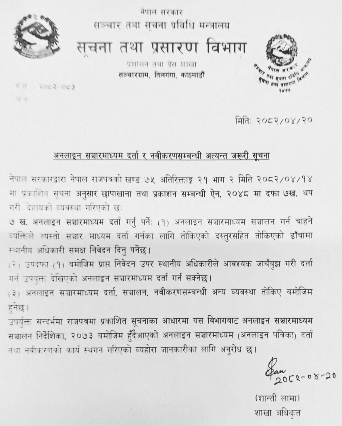 विभागले यसअघि अनलाइन सञ्चारमाध्यम सञ्चालन निर्देशिका, २०७३ बमोजिम हुँदै आएको अनलाइन सञ्चारमाध्यम (अनलाइन पत्रिका) दर्ता तथा नवीकरणको कार्य नयाँ कानुनी व्यवस्थासँग मिलाउन आवश्यक भएको भन्दै अहिलेलाई स्थगित गरिएको जनाएको हो ।