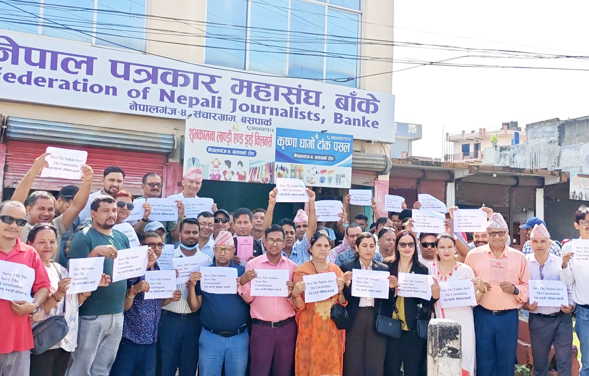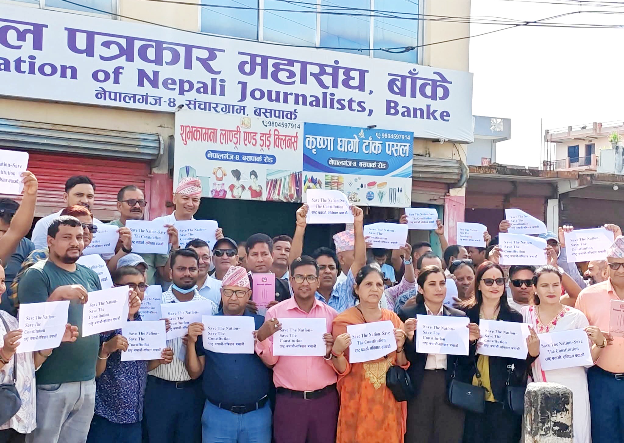 ‘राष्ट्र जोगाऔं-संविधान जोगाऔं’ भन्ने प्लेकार्डसहित नेपाल पत्रकार महासंघ बाँके र नेपाल बार एसोसिएसनको अगुवाई एवम् शान्ति र लोकतन्त्रका लागि पेशागत संगठन (पापड) सहितको आयोजनामा आज नेपालगञ्जमा मौन प्रदर्शन गरिएको हो ।