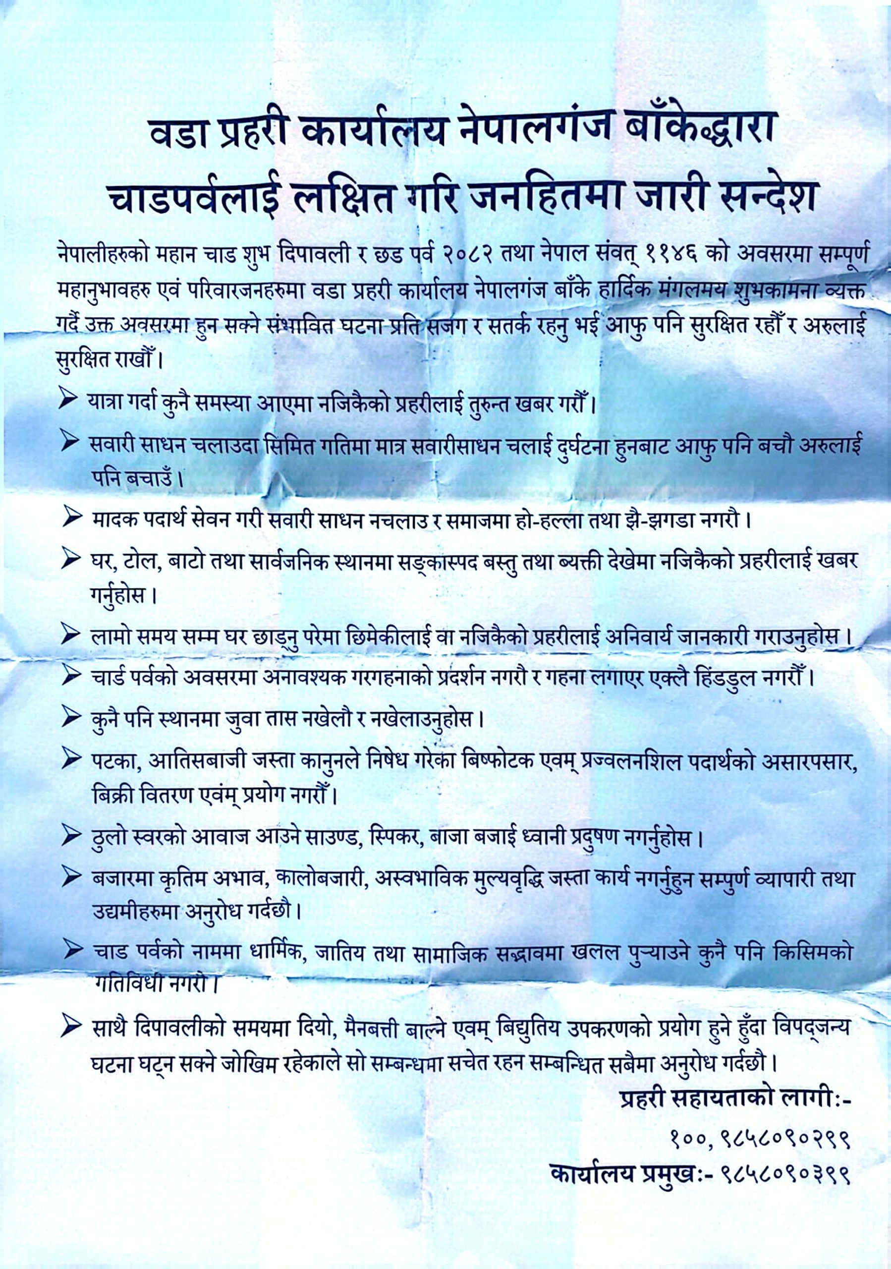 वडा प्रहरी कार्यालय नेपालगन्जले एक विज्ञप्ति प्रकाशित गरि चाडका बेला कुनैपनि अप्रिय घटना नघटोस भन्ने उद्देश्यले शान्ति, सुरक्षा र सुव्यवस्था कायम गर्न सर्वसाधारणहरूलाई विभिन्न सावधानी अपनाउन अपील गरेका हुन ।