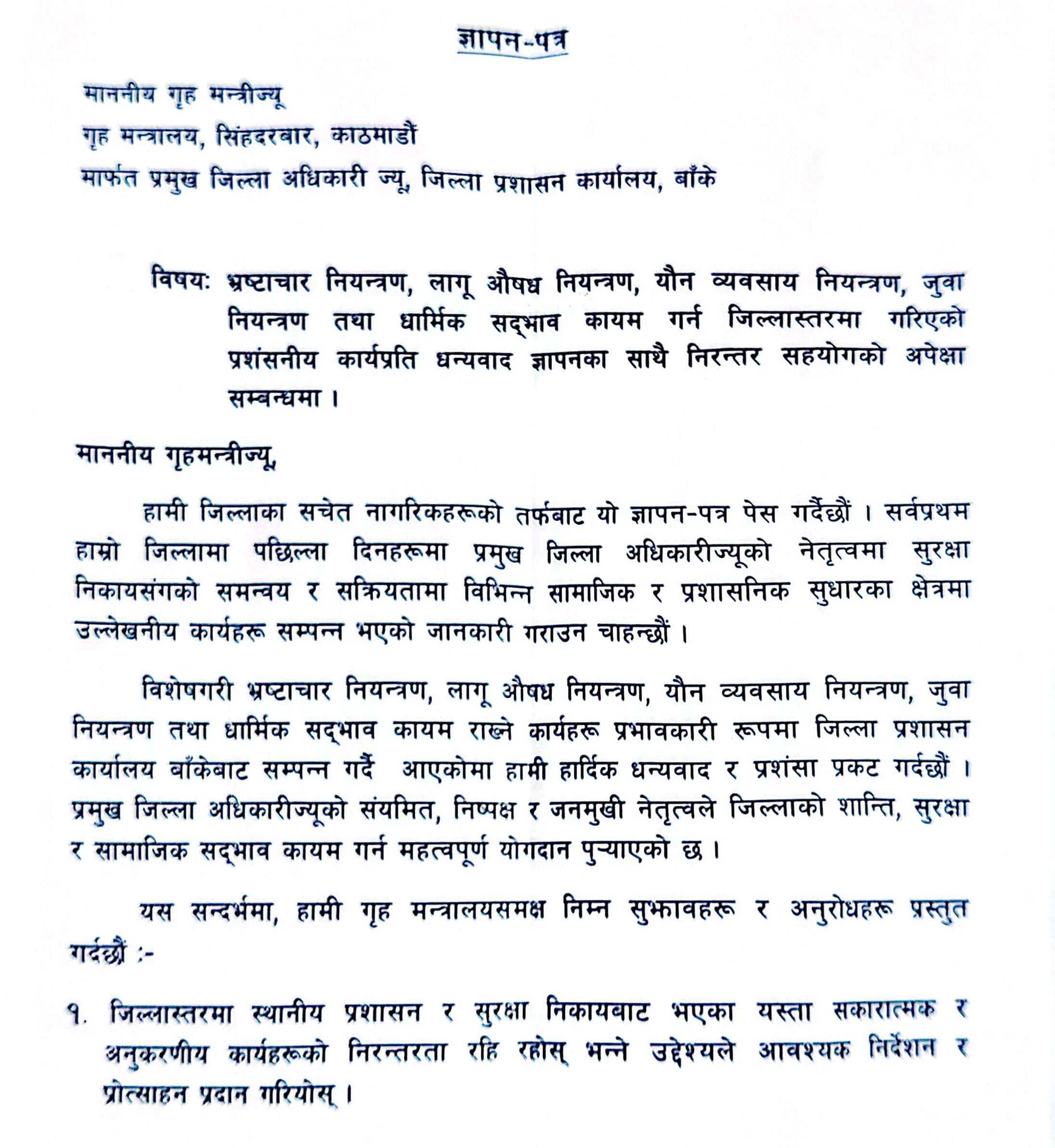 ज्ञापन-पत्रमा जिल्ला प्रशासन कार्यालय बाँकेको इमानदार प्रयास र गृह मन्त्रालयको निरन्तर मार्गदर्शनका लागि धन्यवादका साथै आगामी दिनमा पनि यस्ता जनमुखी प्रशासनिक गतिविधिहरूलाई निरन्तरता दिन मांंग गरिएको हो । शुक्रबार दिउँसो करिब दुईसय जनाको उपस्थितिमा बुझाइएको ज्ञापन-पत्रमा जिल्लामा पछिल्ला दिनहरूमा प्रमुख जिल्ला अधिकारी जोशीको नेतृत्वमा सुरक्षा निकायसंँगको समन्वय र सक्रियतामा विभिन्न सामाजिक र प्रशासनिक सुधारका क्षेत्रमा उल्लेखनीय कार्यहरू सम्पन्न भएको उल्लेख गरिएको छ ।