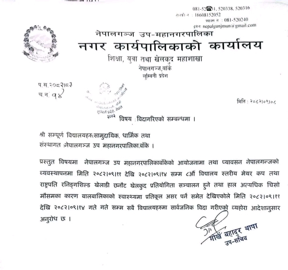 नेपालगन्ज उपमहानगरपालिकाको आयोजना तथा प्याबसन नेपालगन्जको व्यवस्थापनमा प्रतियोगिता सञ्चालन हुने भएकाले सामुदायिक, संस्थागत र धार्मिक विद्यालयमा जाडो बिदा दिइएको शिक्षा, युवा तथा खेलकुद महाशाखाका उपसचिव गार्खबहादुर थापाले एक सूचना प्रकाशित गरि जानकारी दिइएका हुन ।