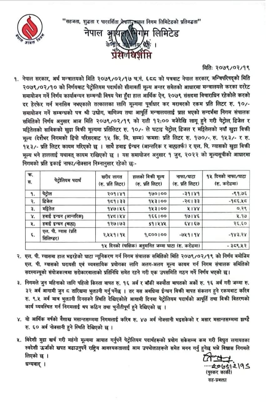 मुल्य घटेसँगै अब पेट्रोल प्रतिलिटरको १ सय ७० र डिजल र मट्टीतेल प्रतिलिटरको १ सय ५३ रुपैयाँमा झरेको छ । निगम सञ्चालक समितिको बैठकले पेट्रोलियम पदार्थको मूल्य घटाउने निर्णय गरेको हो ।यसअघि अर्थ मन्त्रालयले उद्योग, वाणिज्य तथा आपूर्ति मन्त्रालयलाई पत्र पठाएर पूर्वाधार कर घटाएर मूल्य योजन गर्न भनेको थियो ।