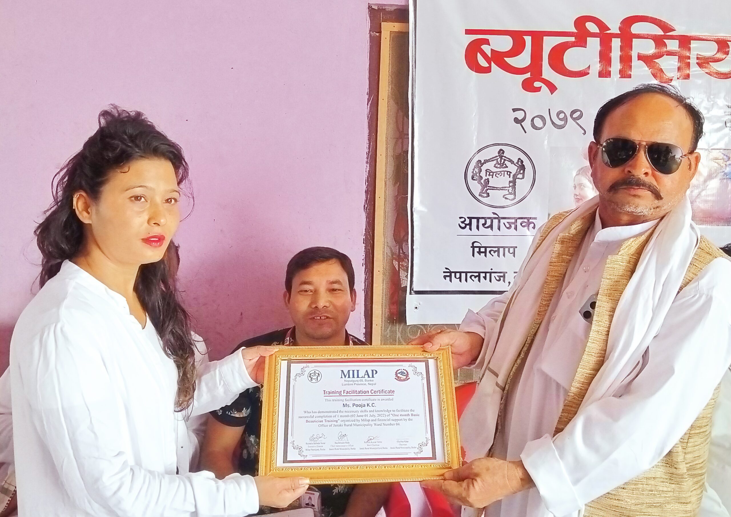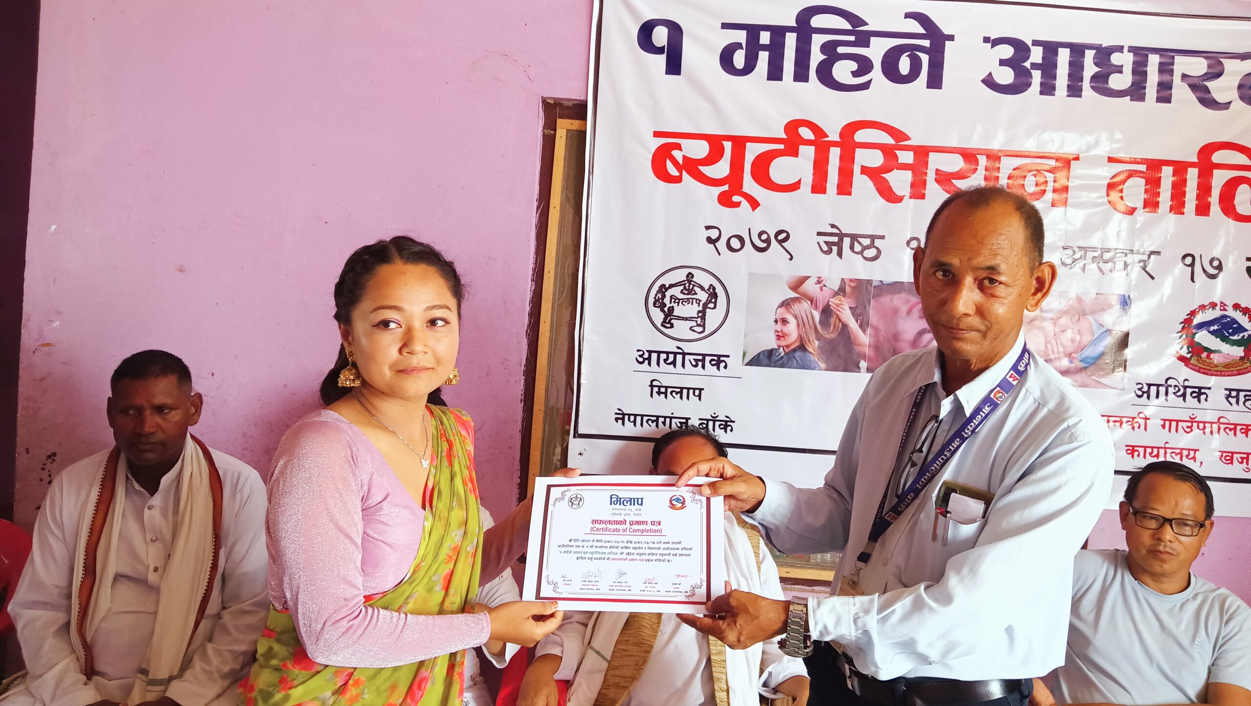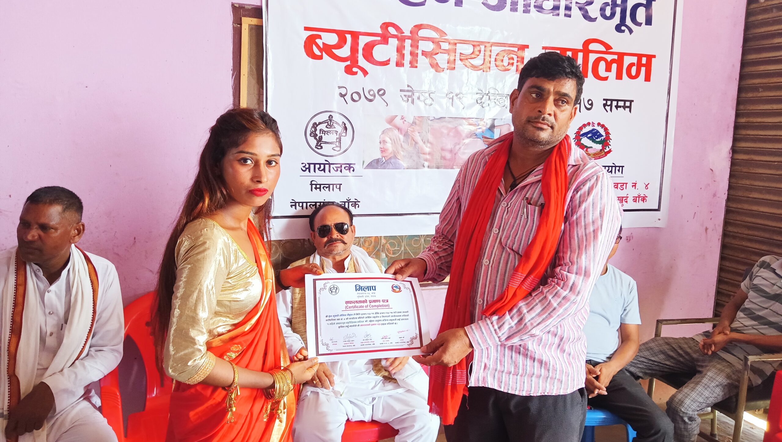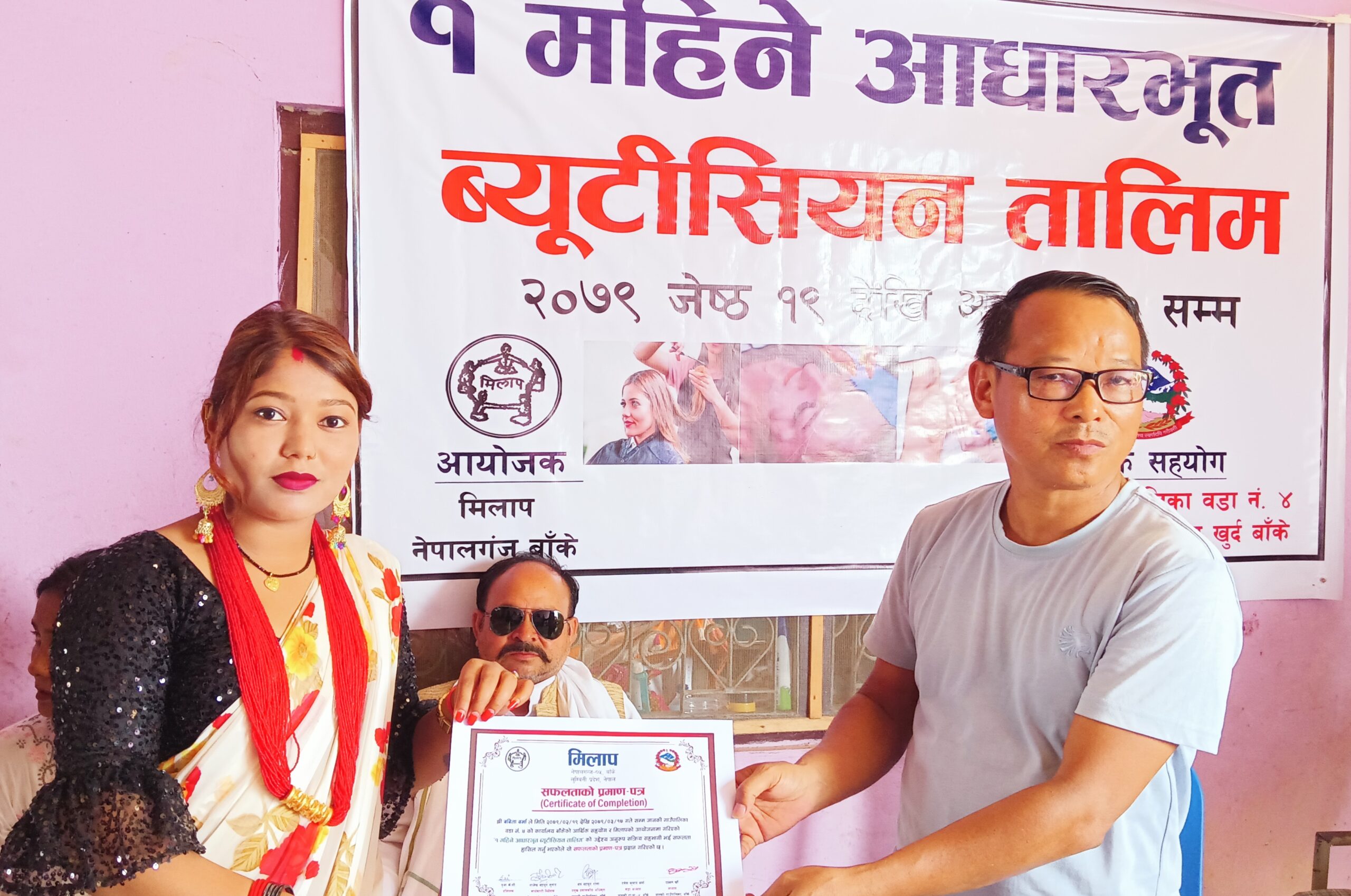 शुक्रबार मिलाप संस्था नेपालगन्जको आयोजनामा र जानकी गाउँपालिका ४ नम्बर वडा कार्यालयको आर्थिक सहयोगमा एक महिने आधारभूत ब्यूटिशियन तालिम सम्पन्न भएको हो ।