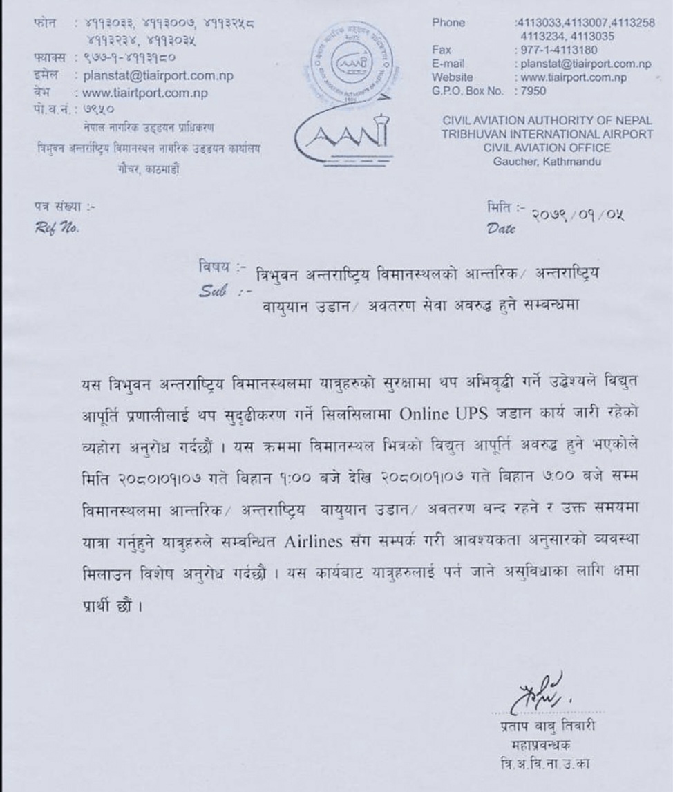 त्रिभुवन अन्तर्राष्ट्रिय विमानस्थल (टीआईए) का अनुसार विमानस्थलमा यात्रुहरुको सुरक्षामा थप अभिवृद्धि गर्ने उद्देश्यले विद्युत् आपूर्ति प्रणालीलाई थप सुदृढीकरण गर्ने सिलसिलामा अनलाइन यूपीएस जडान गर्नु परेकाले सो दिन बिहान १ देखि बिहान ७ बजेसम्म उडान अवरुद्ध हुनेछ ।