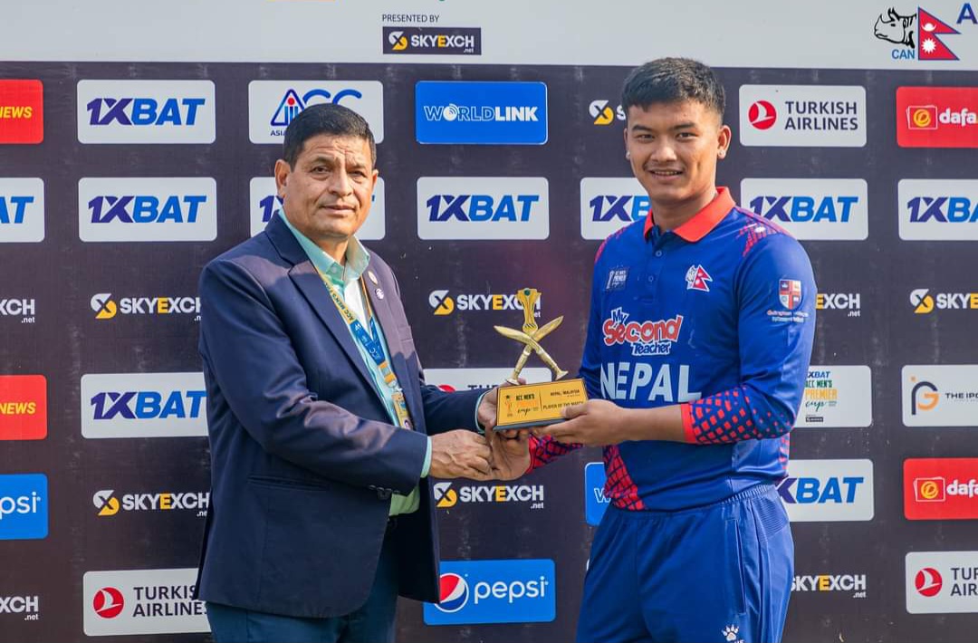 जवाफी ब्याटिङ गरेको नेपालले पहिलो ओभरमै ओपनर आशिफ शेखलाई १ रनमा गुमाएको थियो । त्यसपछि कुशल भुर्तेलले ब्याटिङलाई लयमा ल्याएका थिए । ३८ रन बनाएर भुर्तेल पेबेलियन फर्किएपछि नेपाललाई सुरुवाती दबाब भएको थियो । तर कप्तान रोहित कुमार पौडेल र भीम सार्कीले ब्याटिङलाई लयमा फर्काए । पौडेलले ४२ रनको योगदान गरे भने सार्कीले अर्धसतकीय पारी खेले । नटआउट अर्धसतकीय इनिङ खेलेका कुसल मल्ल म्यान अफ द म्याच घोषित भए ।