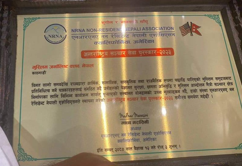 नेपालगन्ज / मुस्लिम जर्नालिस्ट क्लब नेपाल ‘अन्तर्राष्ट्रिय सञ्चार सेवा पुरस्कार २०२३’ बाट पुरस्कृत भएको छ । एन. आर. एन. ए नन रेसिडेण्ट नेपाली एशोसिएसनले क्लबलाई उक्त पुरस्कारबाट पुरस्कृत गरेको हो ।