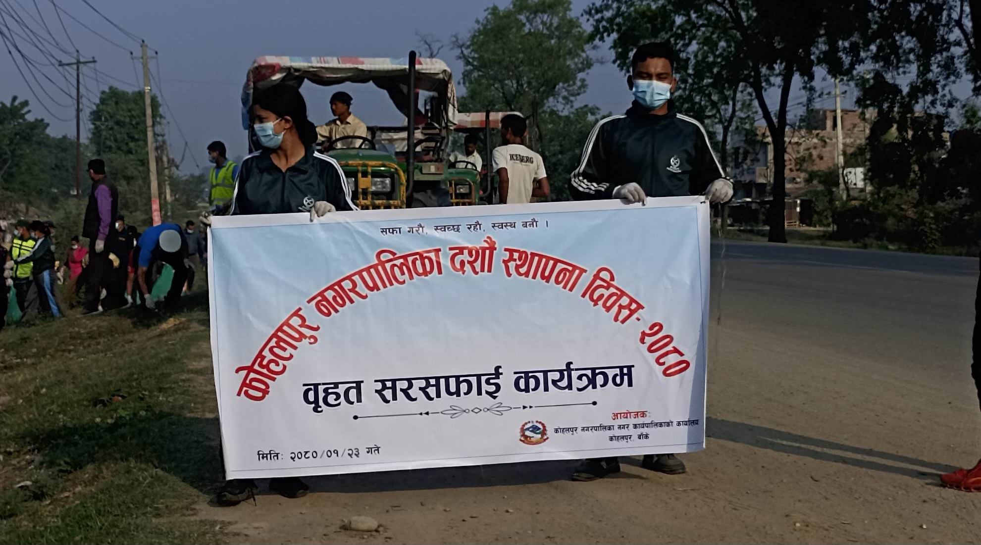 कोहलपुर / सफा गरौं स्वच्छ रहौं, स्वस्थ बनौ भन्ने नारा सहित सरसफाइ कार्यक्रम गरी कोहलपुर नगरपालिकाले स्थापना दिवस मनाउन सुरु गरेको छ । नगर स्थापना दिवसका अवसरमा कोहलपुर नगरपालिकाले आज एक कार्यक्रमका बीच बृहत सरसफाई कार्यक्रम सम्पन्न गरेको हो । कोहलपुर नगरपालिकाका उपमेयर संगिता सुबेदी र जिल्ला समन्वय समितिका उपाध्यक्ष सिता कार्की नगरपालिकाका प्रमुख प्रशासकिय अधिकृत टिकाराम ढकालले कोहलपुर चौराहामा फोहोर टिपि कार्यक्रमको उदघाटन गरेका हुन् ।
