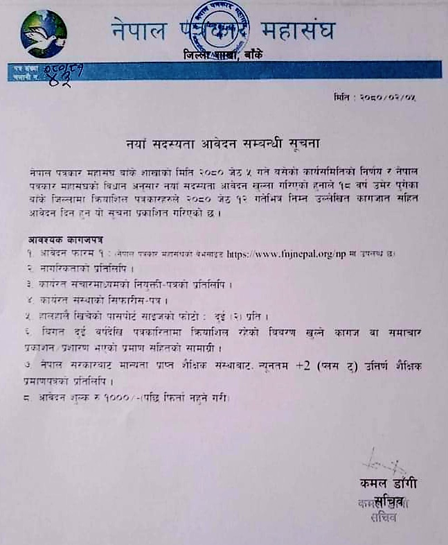 महासंघको विधान अनुसार नयाँ सदस्यताका लागि १८ वर्ष उमेर पुगेका जिल्लामा क्रियाशिल पत्रकारहरुले यही जेष्ठ १२ गतेभित्र नयाँ सदस्यता आवेदन पेश गर्नुपर्ने महासंघ बाँके शाखाले निर्णय गरेको छ । नयाँ सदस्यता आवेदन पेश गर्ने पत्रकारले महासंघको वेबसाईट www.fnjnepal.org.np बाट आवेदन फारम डाउनलोड गरी भर्नुपर्ने महासंघ बाँकेका सचिव कमल डाँगीले सूचना प्रकाशित गरि जानकारी गराइएको छ ।