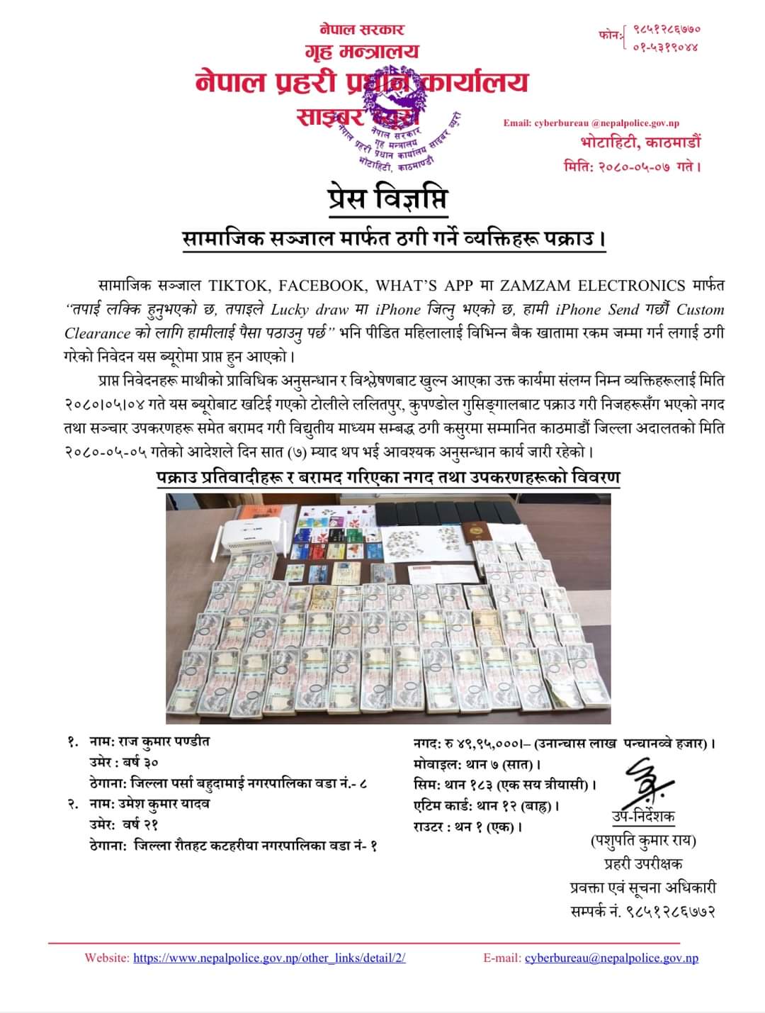 नगद रु ४९ लाख ९५ हजार, मोवाइल ७ थान, सिम १८३ थान, एटिम कार्ड १२ थान र राउटर १ थान सहित पक्राउ परेकाहरुलाई नगद तथा सञ्चार उपकरण विद्युतीय माध्यम सम्बद्ध ठगी कसुरमा जिल्ला अदालत काठमाडौंबाट भदौ ५ गते ७ दिनको म्याद थप गरि आवश्यक अनुसन्धान अगाडी बढाइएको जनाएको छ ।