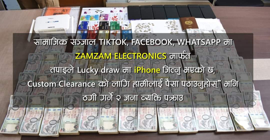 काठमाडौं / सामाजिक सञ्जाल फेसबुक, टिकटक तथा व्याट्सप मार्फत तपाईले जमजम इलेक्ट्रोनिकसको लक्की ड्रबाट आईफोन (iPhone) जित्नु भएको छ, हामी आईफोन पठाउँछौ (Customs Clearance)का लागि पैसा पठाउनु पर्छ भनी पीडित महिलालाई विभिन्न बैक खातामा रकम जम्मा गर्न लगाई ठगी गर्नेलाई नेपाल प्रहरी साइबर व्यूरोले पक्राउ गरेको छ ।