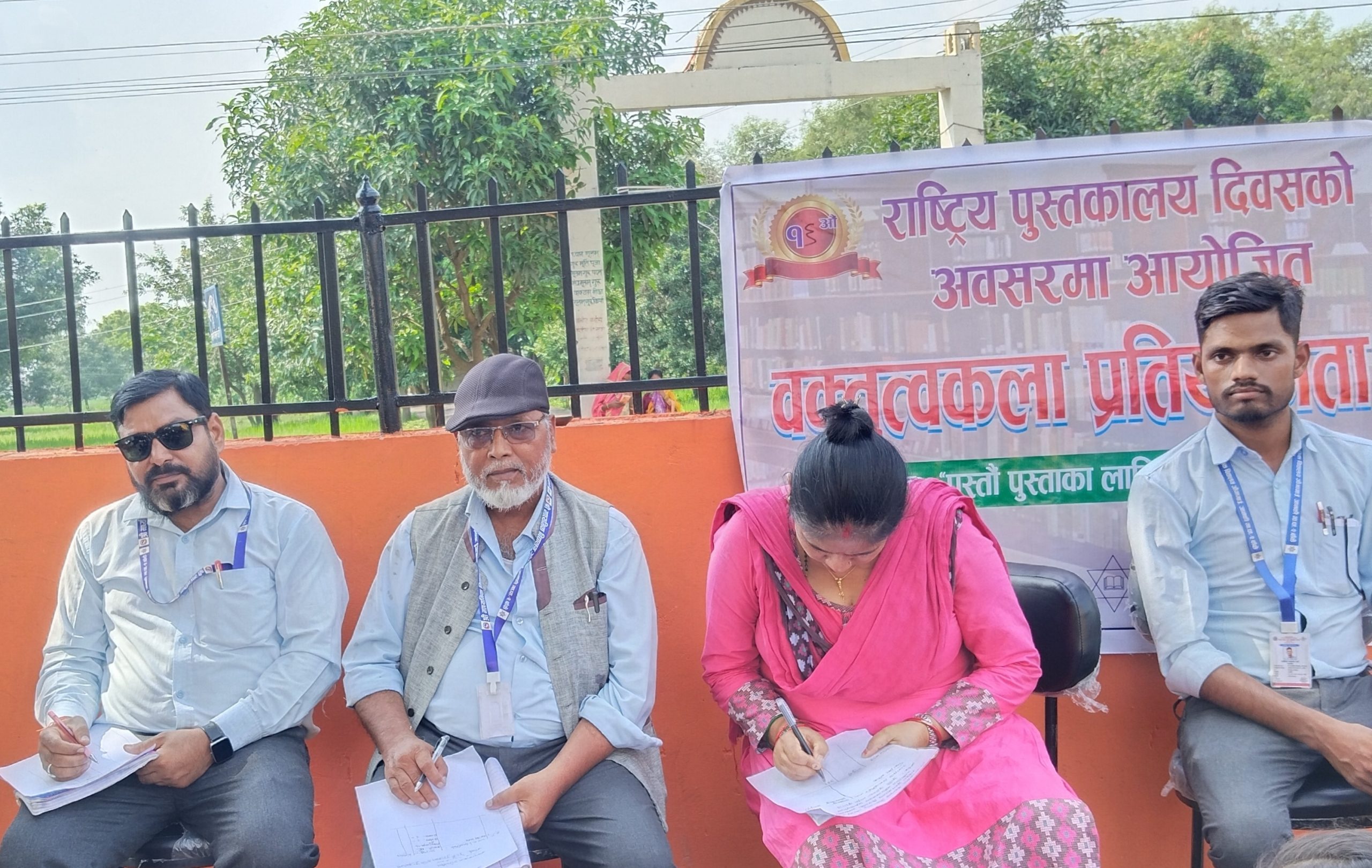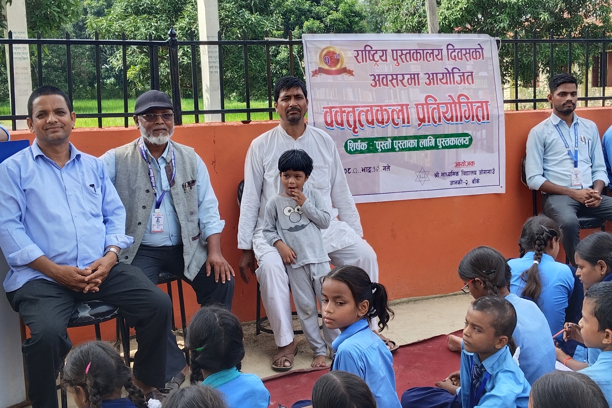 नेपालगन्ज / १६ औं राष्ट्रिय पुस्तकालय दिवसको अवसरमा आयोजित पुस्तौ पुस्ताका लागि पुस्तकालयको महत्व विषयक वक्तृत्वकला प्रतियोगिता सम्पन्न भएको छ । जानकी गाउँपालिका वडा नं. २ स्थित श्री माध्यमिक विद्यालय जोगागाउँको आयोजनामा र विद्यालय व्यवस्थापन समितिका अध्यक्ष रज्जब अली हल्वाईको प्रमुख अतिथित्वमा बुधबार कार्यक्रम सम्पन्न भएको हो ।