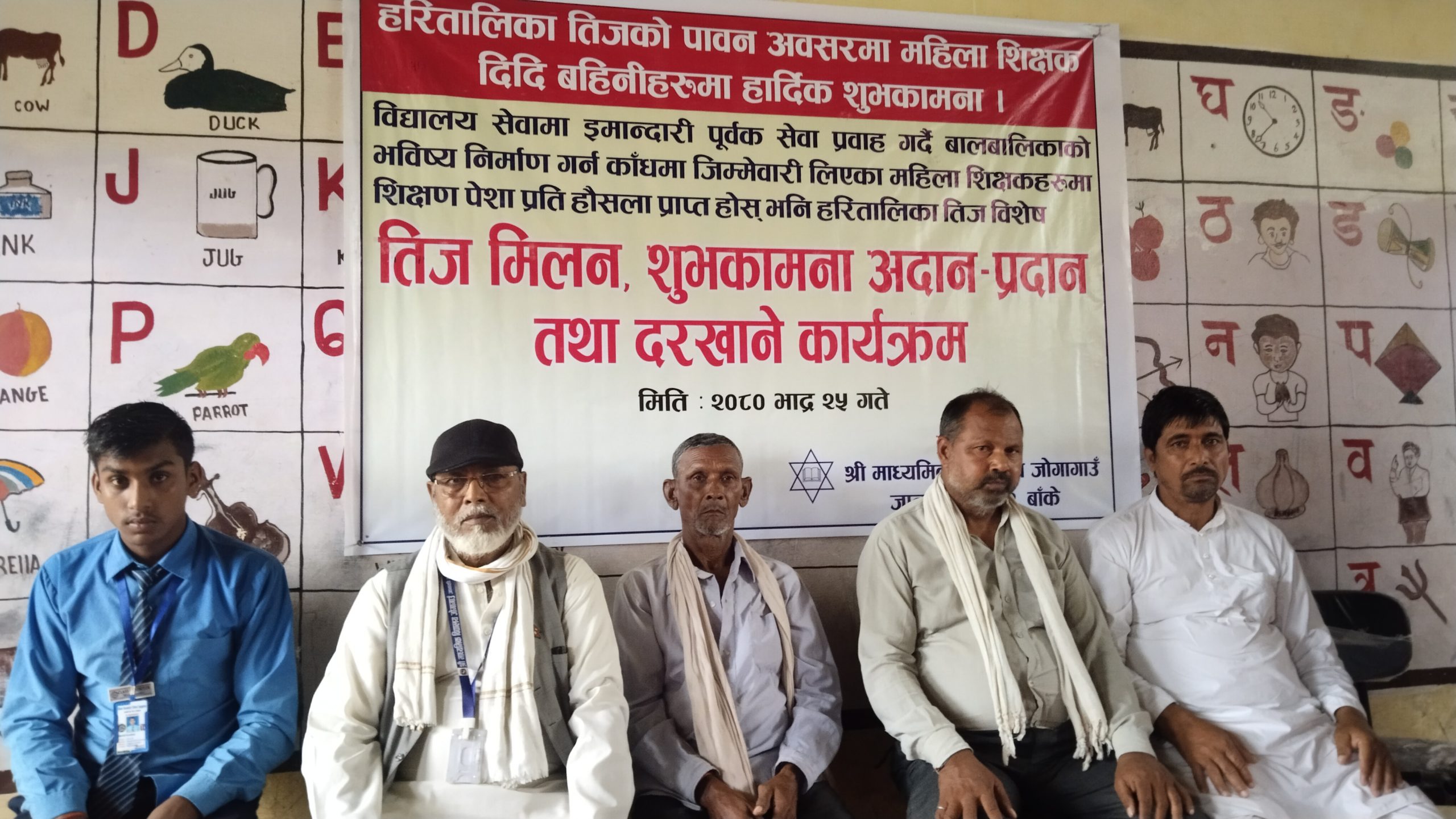 नेपालगन्ज / बाँकेको जानकी गाउँपालिका वडा नम्बर- २, स्थित श्री मा. वि. जोगागाउँले आज तीज मिलन शुभकामना आदानप्रदान तथा दर खाने कार्यक्रम गरेको छ । नेपाली महिलाहरूको महान पर्व हरितालिका तीजको अवसरमा सोमबार विद्यालय प्रङणमा एक कार्यक्रमको आयोजना गरी तिज मिलन शुभकामना आदानप्रदान तथा दर खाने कार्यक्रम गरेको हो ।विद्यालयका प्रधानाध्यापक मो. आलमीन राईको सभापतित्वमा तथा विद्यालय व्यवस्थापन समितिका अध्यक्ष रज्जब अली हल्वाईको प्रमुख अतिथिमा भएको तीज विशेष कार्यक्रममा महिला शिक्षकहरूले तीजको विभिन्न गीतहरुमा नाचगान गरी एकाअर्कालाई तीजको शुभकामना आदानप्रदान गरेकी थिइन । भने विभिन्न प्रकारका खानेकुराहरुको परिकारको दर समेत खुवाइएको थियो ।