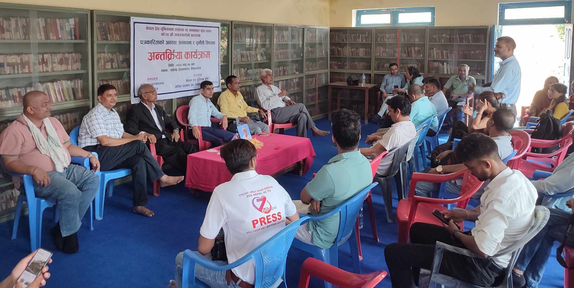 कार्यक्रममा प्रेस युनियन बाँकेका पुर्व अध्यक्ष जयनारायण शाह, पत्रकार महासंघ बाँके शाखाका पूर्व अध्यक्ष रुद्र सुवेदीले पत्रकारको संख्या सयौंमा रहेको तर यसबाटै जिविकोपार्जन गर्ने पत्रकारहरुकोे वास्तविक संख्या धेरै कम भएको बताए । उनीहरूले वर्तमान समयमा हुवहु नकल गर्ने, नामको मात्रै पत्रकार बन्ने र सक्रिय पत्रकारहरु क्षेत्रलाई जोखिममा पार्ने काम भइरहेको बताए ।