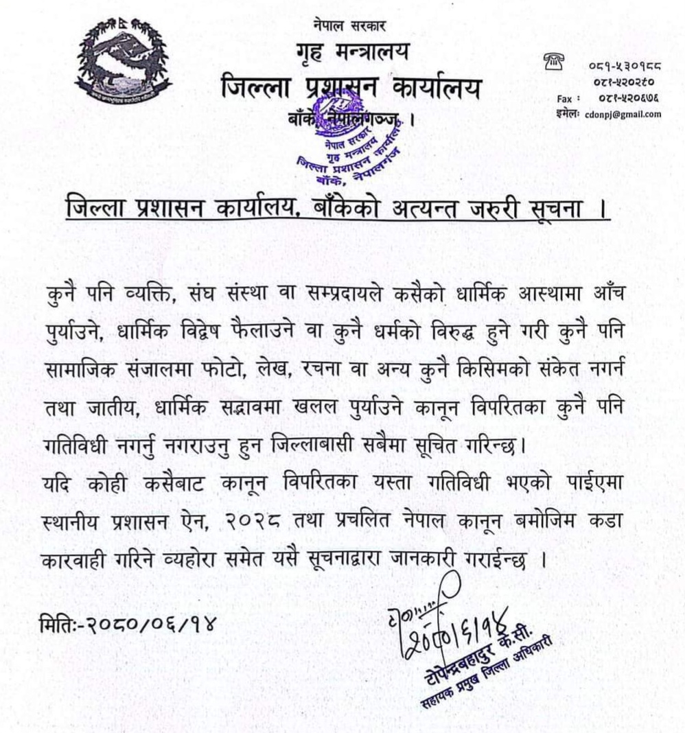 यसैबीच, जिल्ला प्रशासन कार्यालय, बाँकेले धार्मिक सद्भाव कायम राख्न सबैलाई अनुरोध गरेको छ । सहायक प्रमुख जिल्ला अधिकारी टोपेन्द्रबहादुर केसीले आइतबार एक सूचना जारी गरि कानून विपरित कुनै पनि व्यक्ति, संघ संस्था वा सम्प्रदायले कसैको धार्मिक आस्थामा आँच पुर्याउने, धार्मिक विद्वेष फैलाउने वा कुनै धर्मको विरुद्ध हुने गरी कुनै पनि सामाजिक संजालमा फोटो, लेख, रचना वा अन्य कुनै किसिमको संकेत नगर्न तथा जातीय, धार्मिक सद्भावमा खलल पुर्याउने कानून विपरितका कुनै पनि गतिविधी नगर्न आग्रह गर्नुभएको हो । यदि कोही कसैबाट कानून विपरितका यस्ता गतिविधी भएको पाईएमा स्थानीय प्रशासन ऐन, २०२८ तथा प्रचलित नेपालको कानून बमोजिम कडा कारवाही गरिने चेतावनी समेत दिएको बिज्ञप्तिमा उल्लेख छ ।