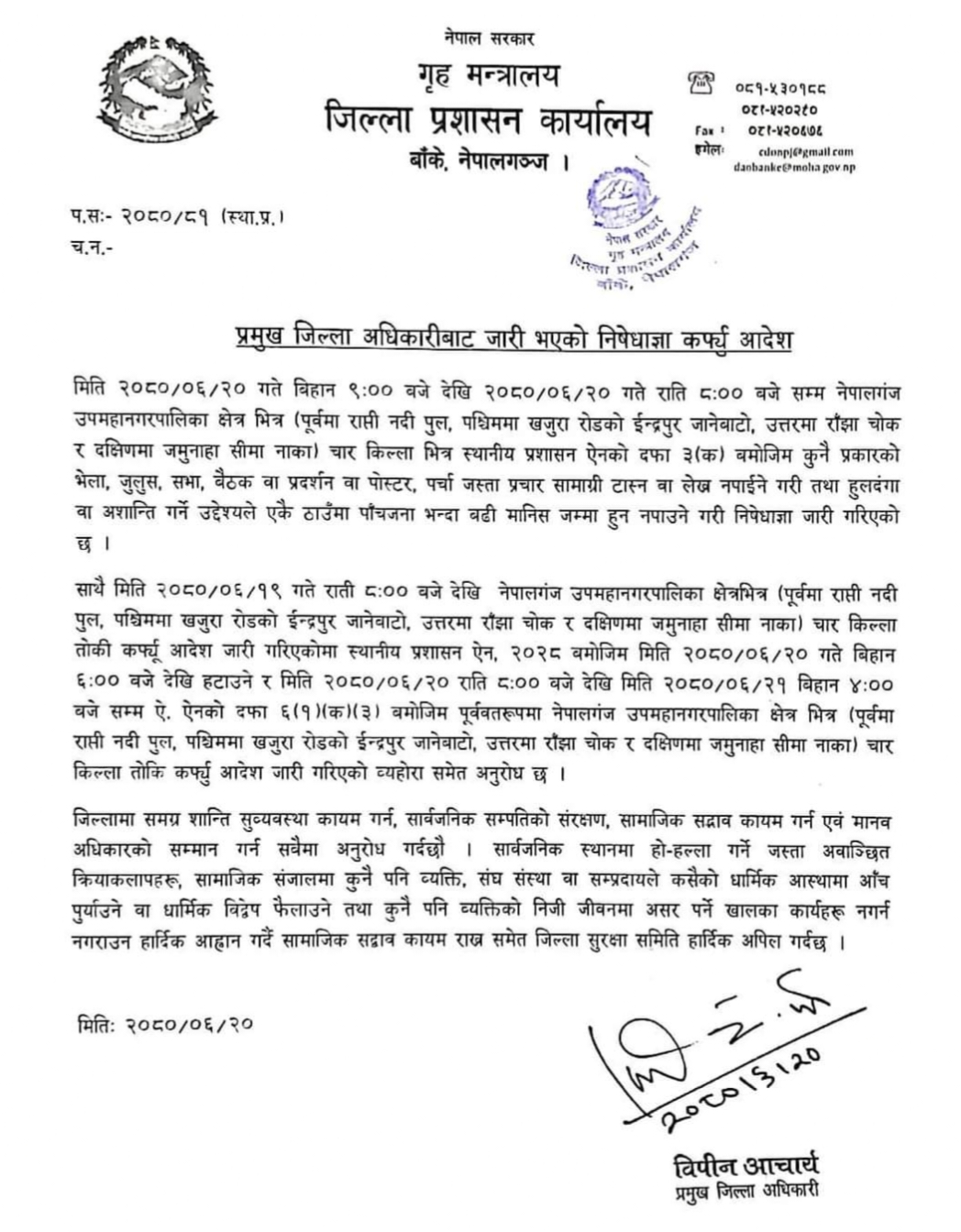 जसअनुसार आज बिहान ९ बजेदेखि राति ८ बजेसम्म निषेधाज्ञा जारी रहनेछ भने राति ८ बजेदेखि बिहान ४ बजेसम्म कर्फ्यु जारी रहने प्रमुख जिल्ला अधिकारी बिपिन आचार्यले जानकारी दिए । यसअघि बिहान ८ बजेदेखि निषेधाज्ञा र राती ८ बजेदेखि बिहान ६ बजेसम्म कर्फ्यु लगाउँदै आइएको थियो ।