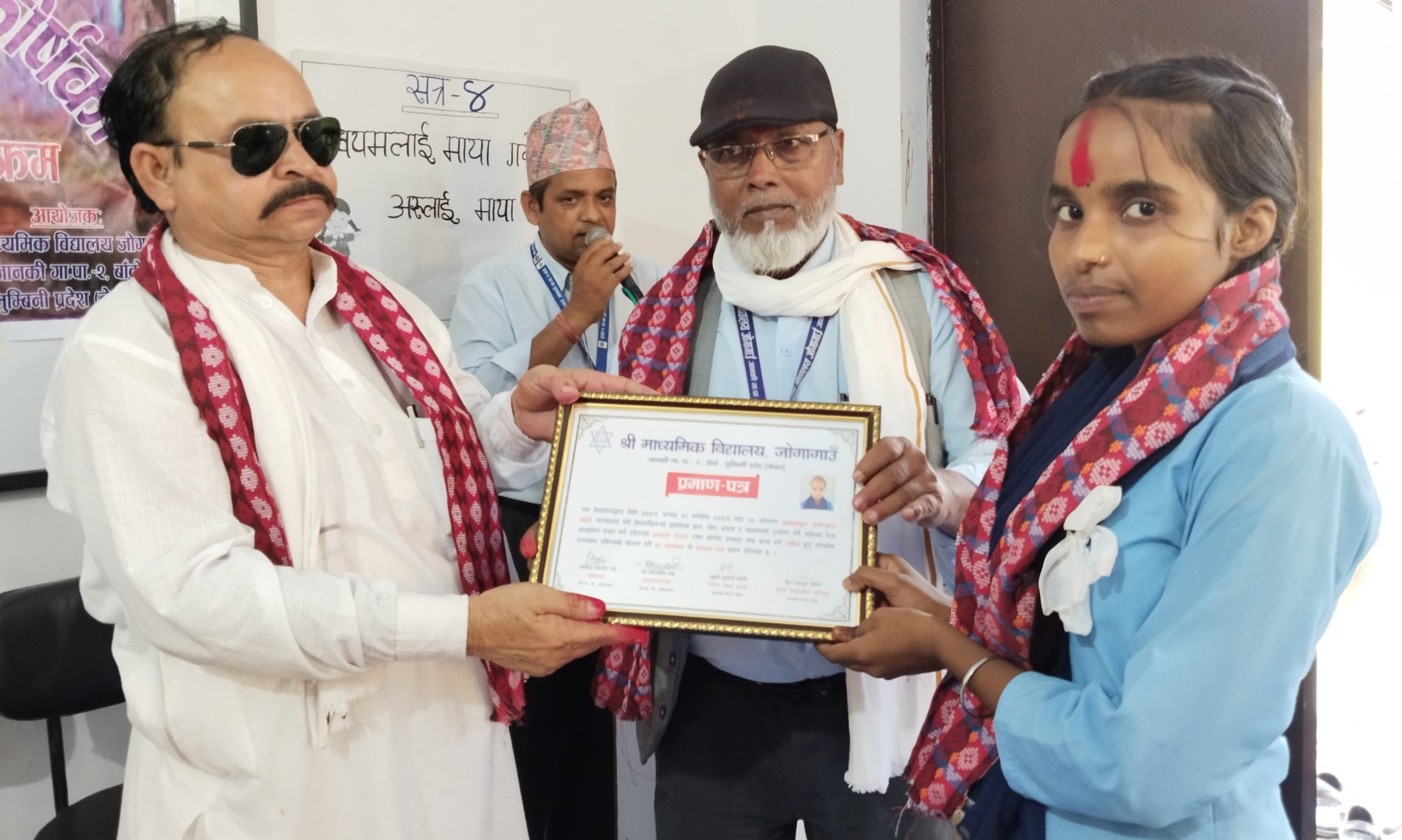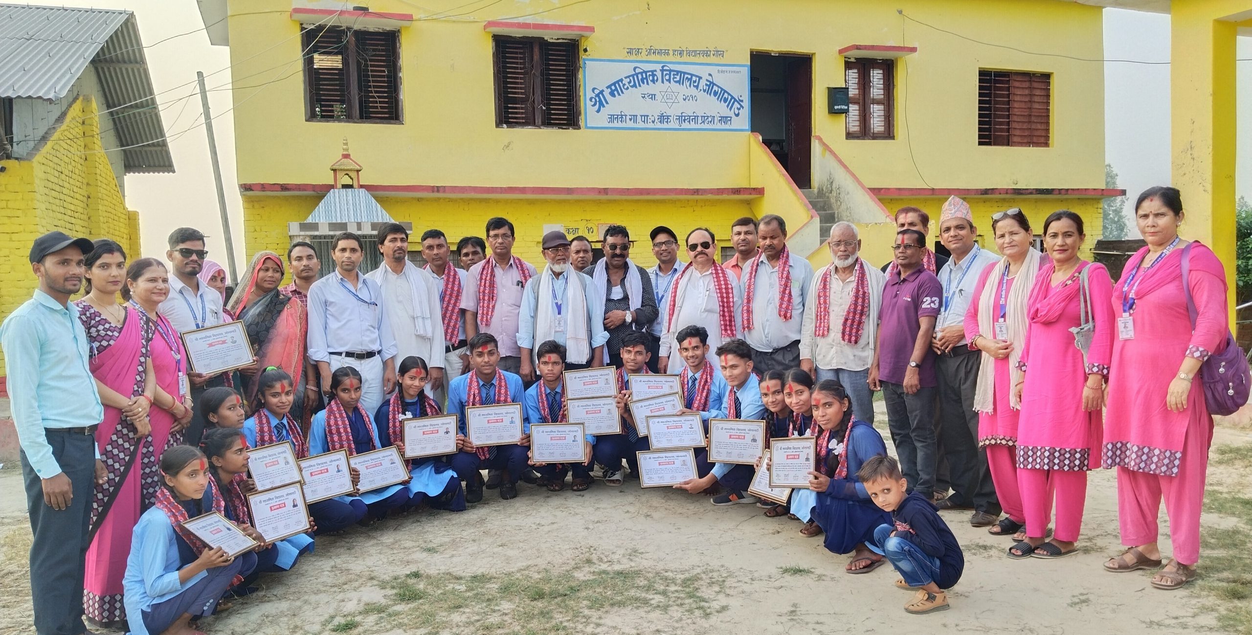 नेपालगन्ज / बाँकेको जानकी गाउँपालिका वडा नम्बर २ स्थित श्री माध्यमिक विद्यालय जोगागाउँले आयोजना गरेको ३ महिने आधारभूत कम्प्युटर कोर्षको आज एक कार्यक्रमका बीच प्रमाणपत्र वितरण गरि सम्पन्न गरिएको छ । सीप सिकौं आत्मनिर्भर बनौं भन्ने मूल नारासहित कम्प्युटर कोर्षमा सहभागी ९ जना छात्रा र ५ जना छात्र गरि १४ जना विद्यार्थीहरुलाई आइतबार खादा टीका लगाएर प्रमाणपत्र वितरण गरि कार्यक्रम सम्पन्न गरिएको हो ।