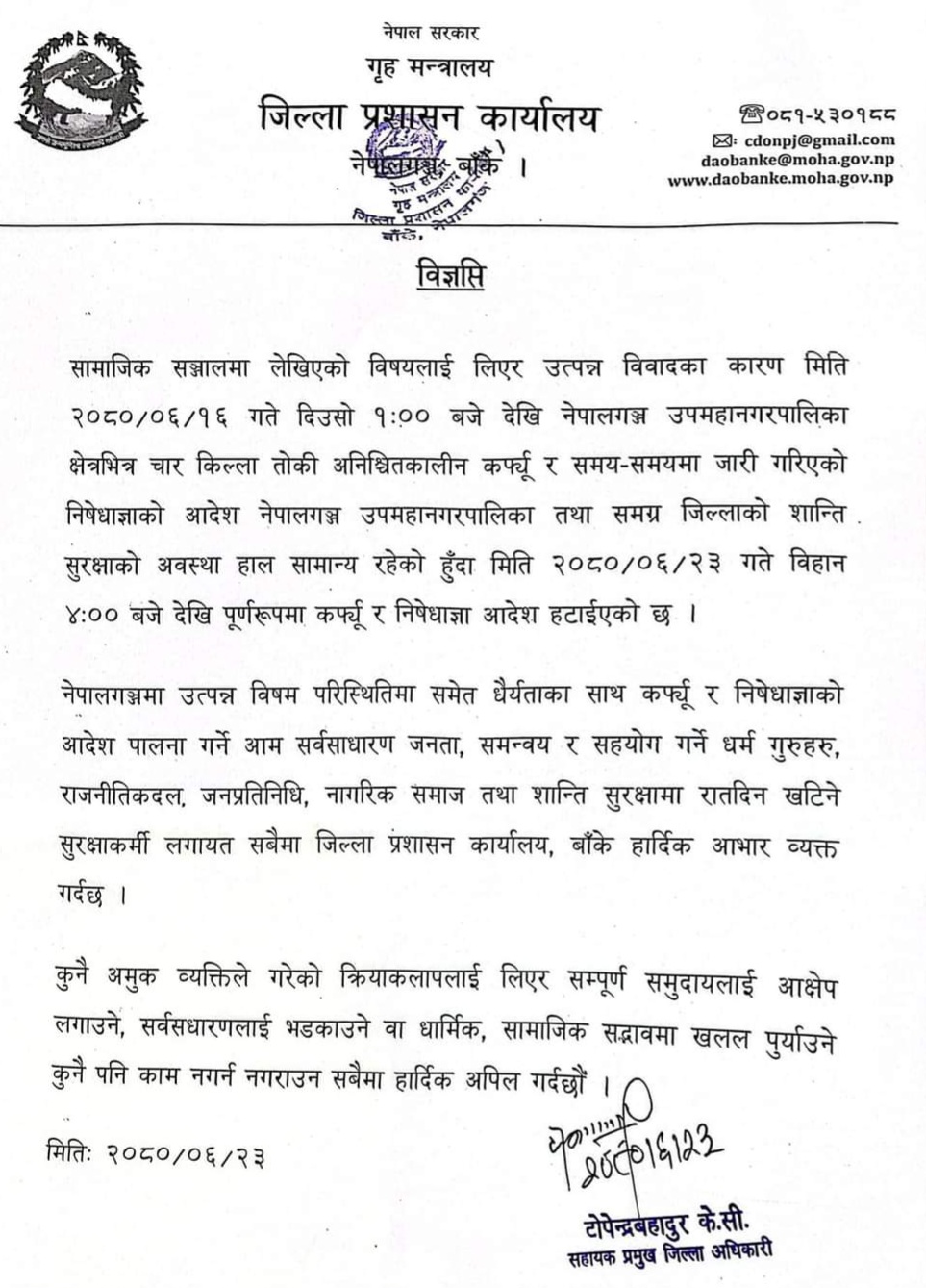 नेपालगन्जमा उत्पन्न बिषय परिस्थितिमा समेत धैर्यताका साथ कर्फ्यु र निषेधाज्ञाको आदेश पालन गर्ने आम सर्वसाधारण जनता, समन्वय र सहयोग गर्ने धर्म गुरुहरु, राजनीतिक दल, जनप्रतिनिधि, नागरिक समाज तथा शान्ति सुरक्षामा रातदिन खटिने सुरक्षाकर्मी लगायत सबैमा बाँके प्रशासनले हार्दिक अभार व्यक्त गरेको छ ।